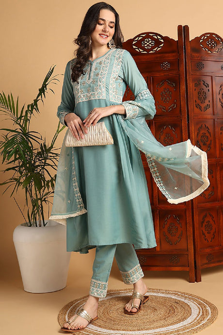 Sea Green Silk Blend Solid Embroidered Anarkali Suit Set