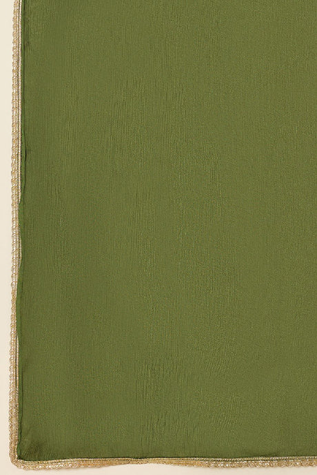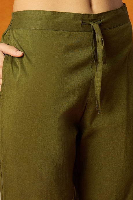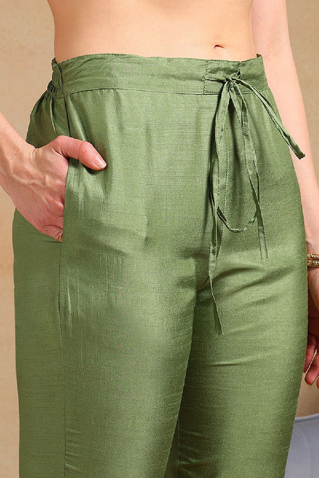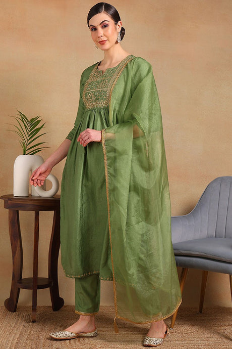 Olive Green Silk Blend Solid Embroidered Straight Cut Suit Set