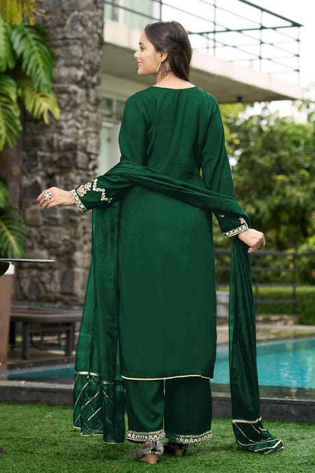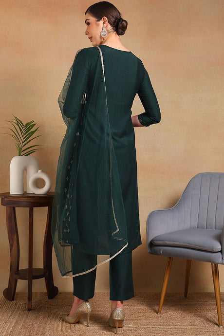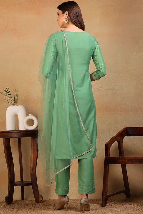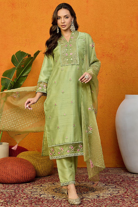 Green Silk Blend Solid Embroidered Straight Cut Suit Set