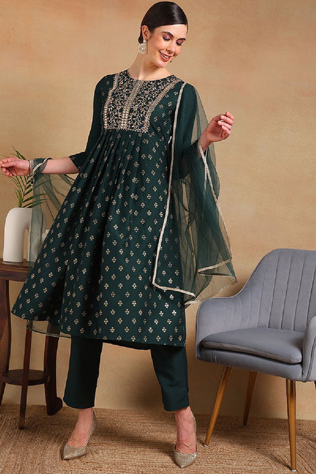 Green Silk Blend Solid Embroidered Flared Anarkali Suit Set