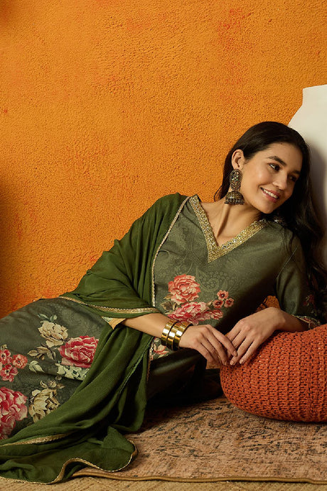 Olive Cotton Blend Floral Printed Straight Cut Suit Set