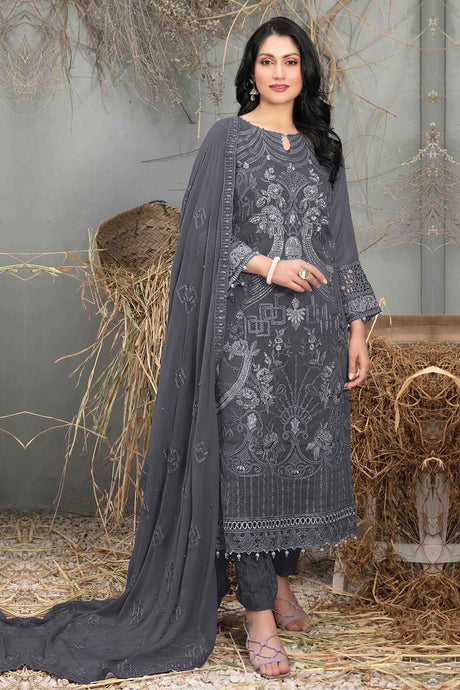 Grey Viscose Rayon Abstract Embroidered Straight Cut Suit Set