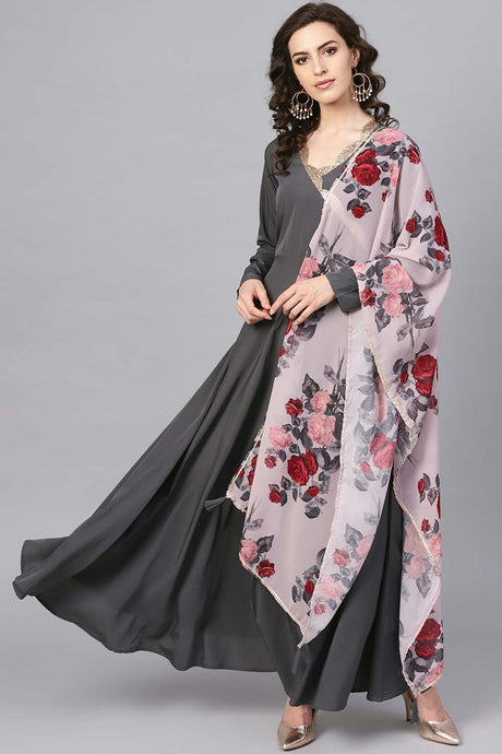 Grey Floral Printed Cotton Anarkali