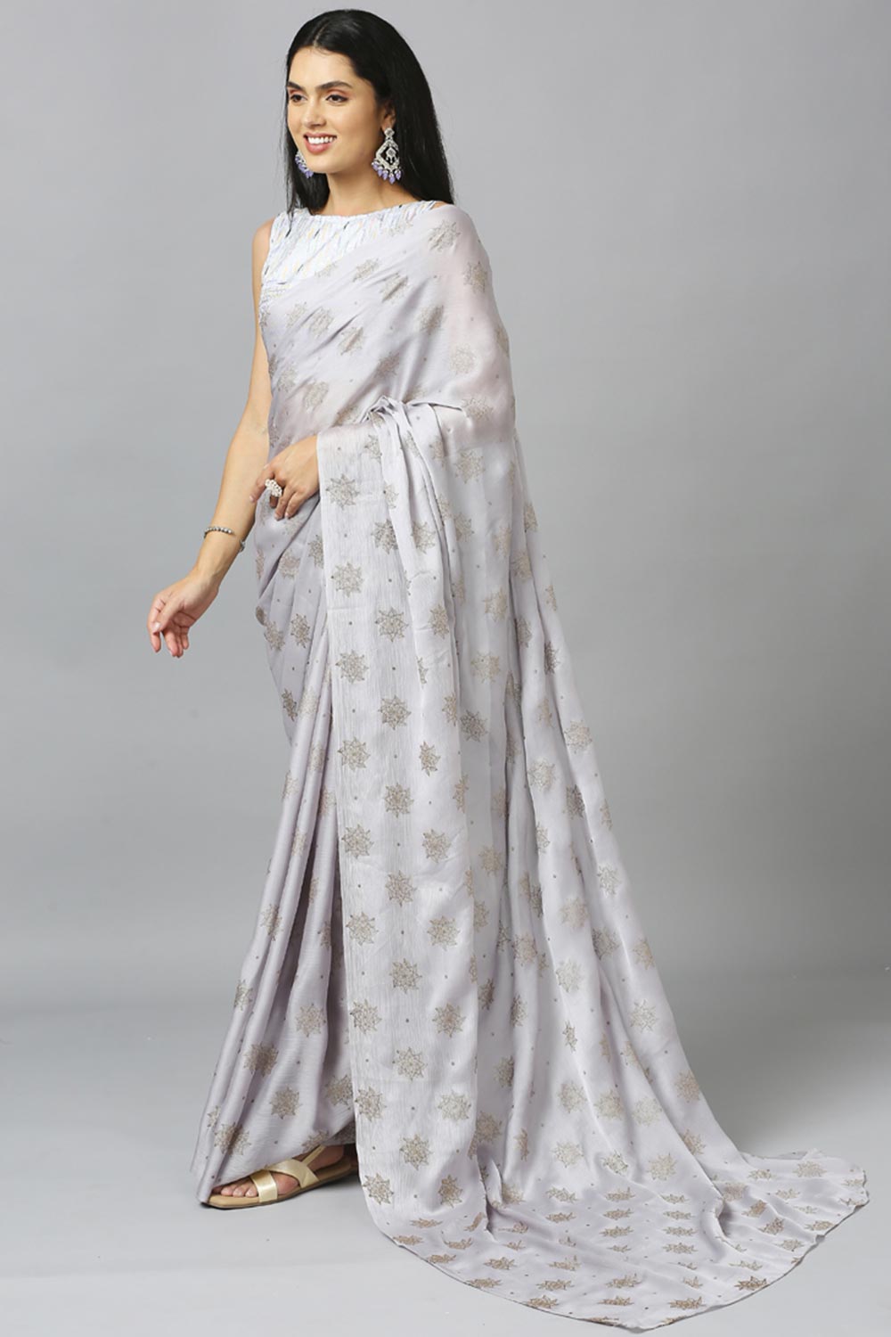 Grey Chiffon Resham Embroidery Party Wear Designer Saree