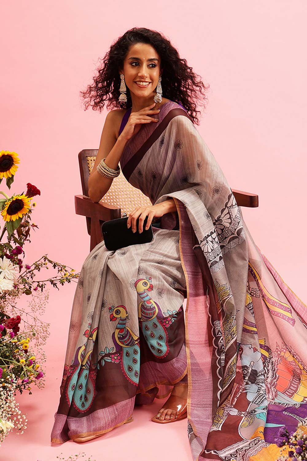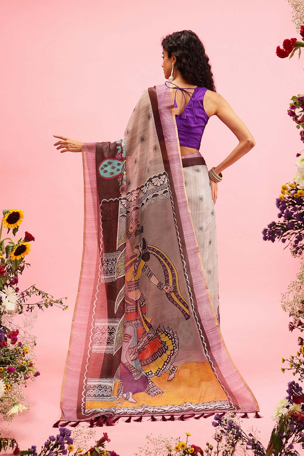 Grey Cotton Blend Printed Madhubani Saree