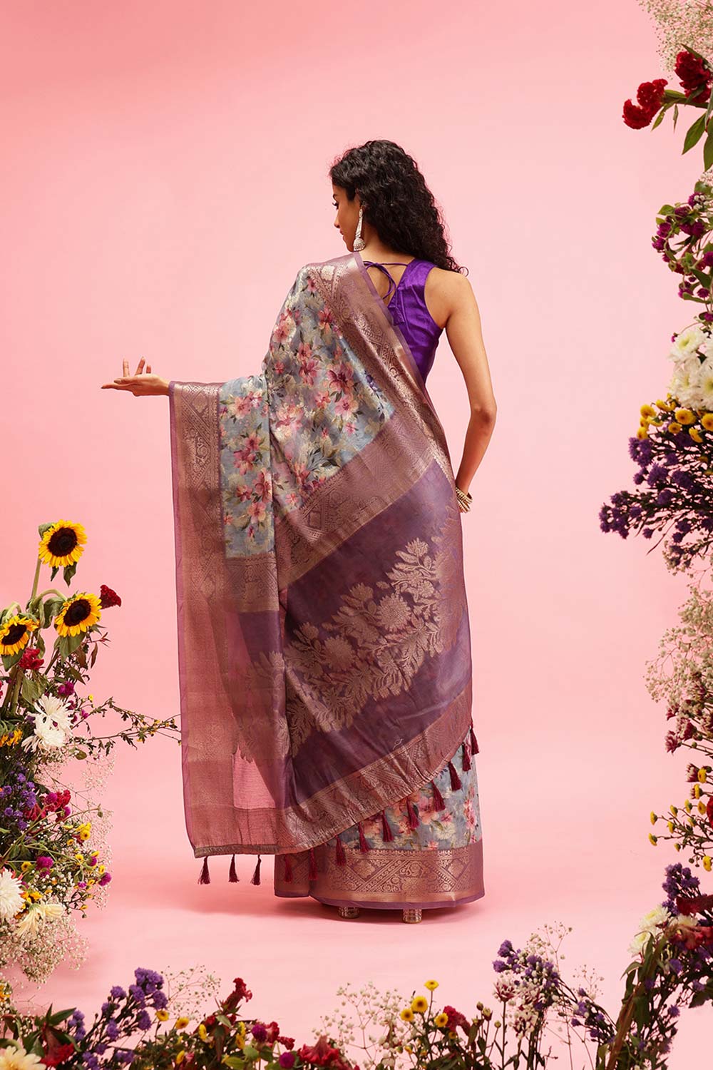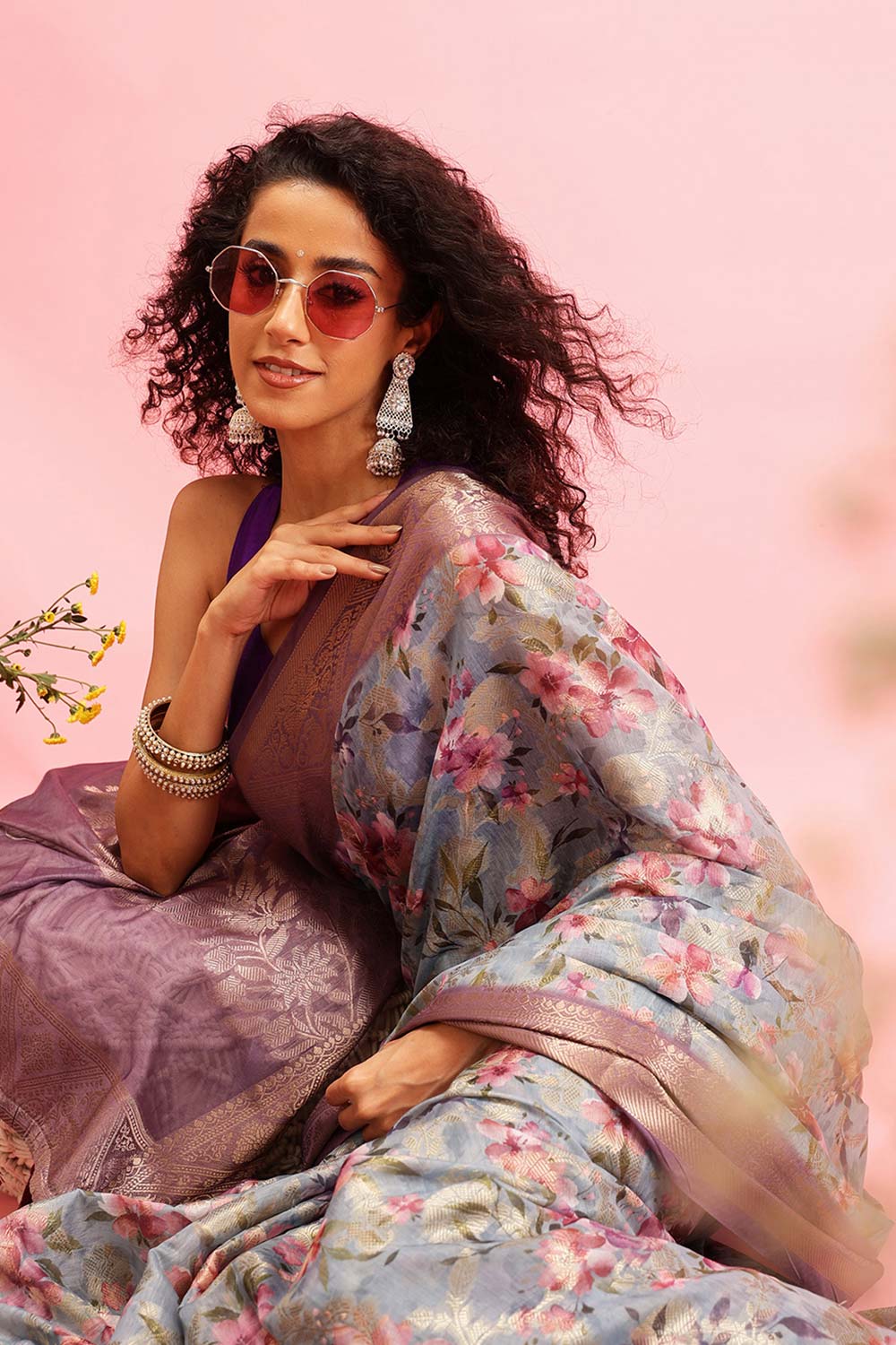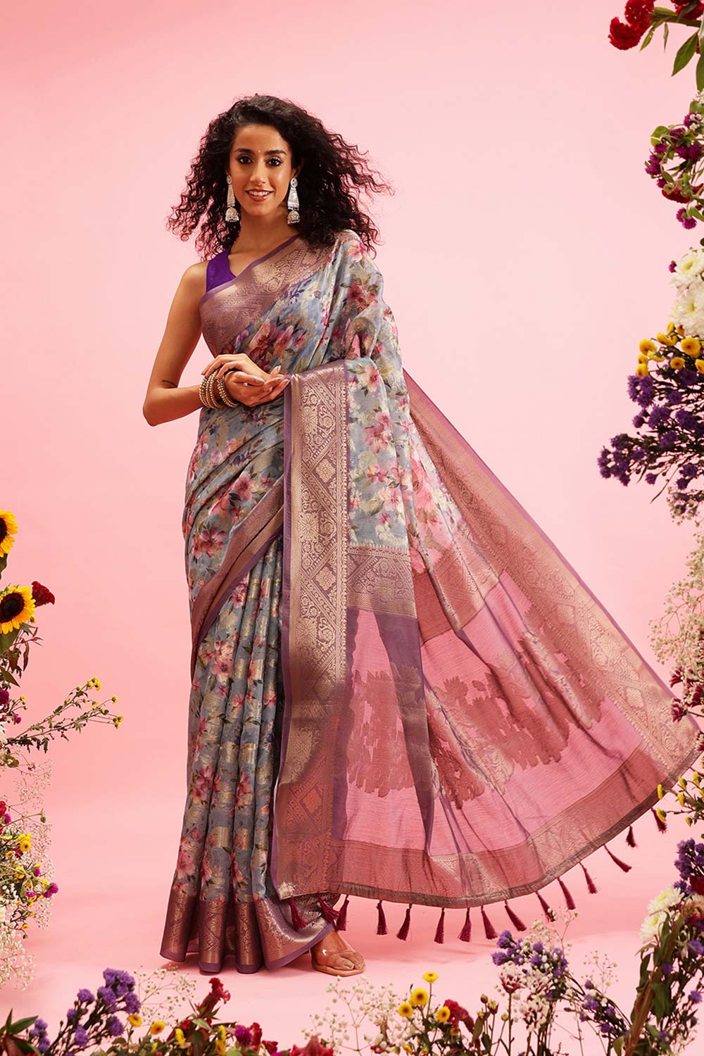 Step into luxury with this Grey Cotton Digital Print Banarasi Saree , showcasing detailed woven patterns that offer a blend of opulence and traditional beauty.