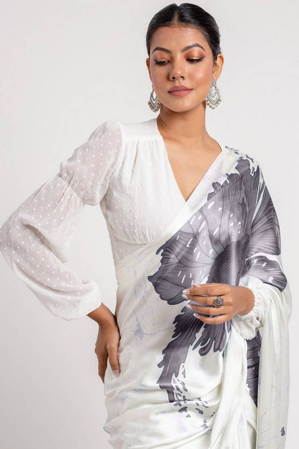 Elevate your wardrobe with our exquisite Saree a masterpiece crafted to add timeless elegance to your style. Made from Satin this saree offers a perfect mix of comfort and sophistication. Adorned with Floral Printed it showcases intricate craftsmanship that speaks volumes of tradition and artistry. Perfect for Casual this saree is a versatile addition to your collection, ensuring you stand out effortlessly. Pair it with elegant Jewelry, for a glamorous look. Add Clutches or Potli Bags and complete the ensemble with Wedges & Heels , making it a perfect choice for any event. Make a statement and embrace the elegance of Saree Today