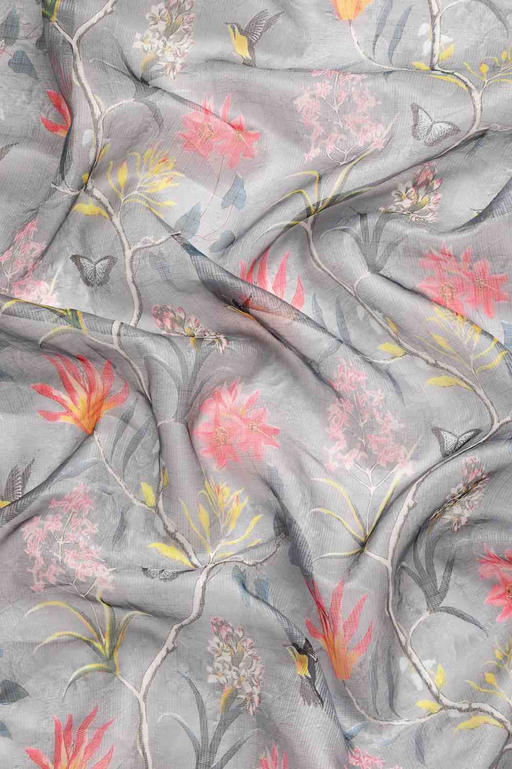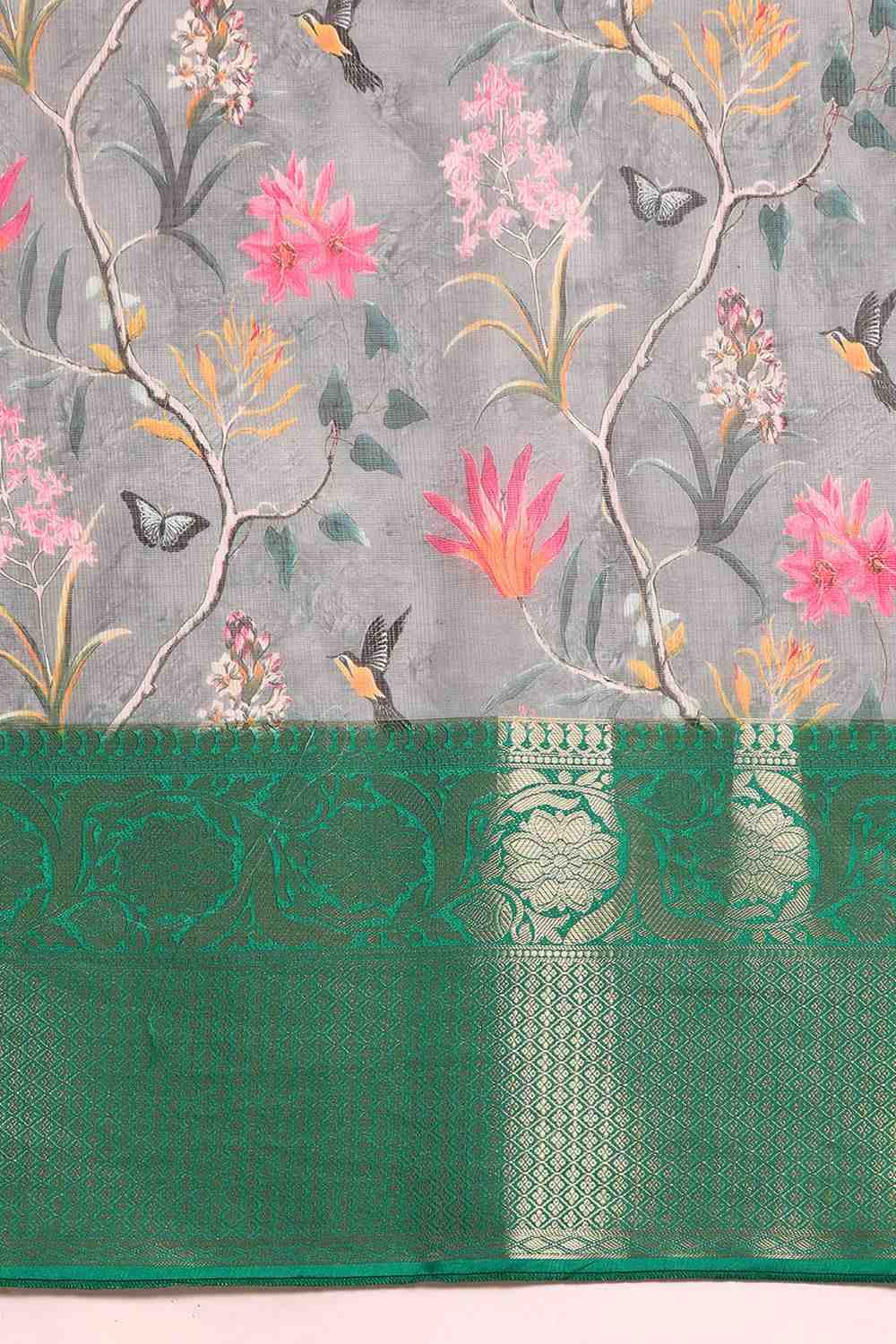 Grey Floral Printed Silk Saree