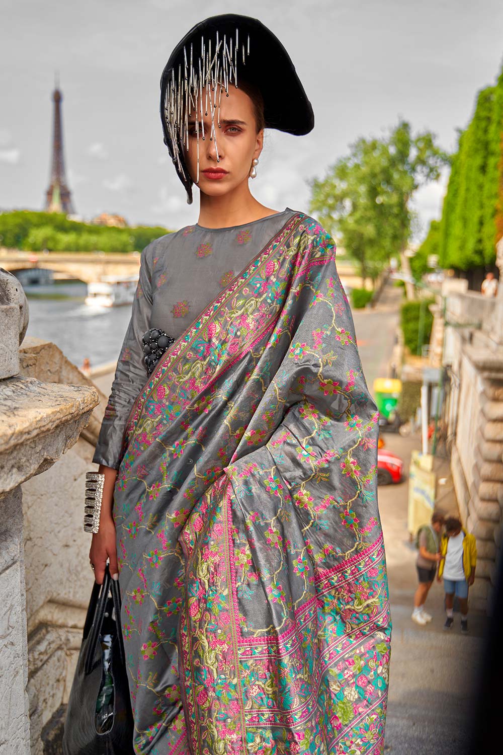 Silk Grey Woven Handloom Saree is a sophisticated and versatile garment that combines the luxurious feel of silk with a refined grey hue.