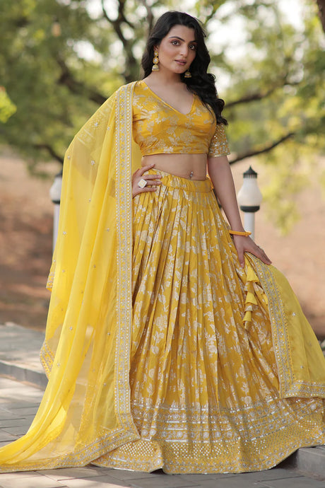 Yellow Floral Embroidered Lichi Fabric With Jacquard Border Lehenga