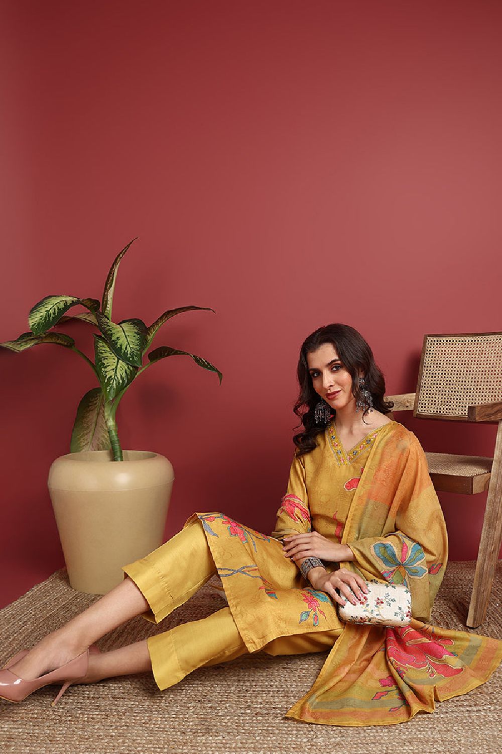 Mustard Silk Blend Floral Printed Straight Cut Suit Set