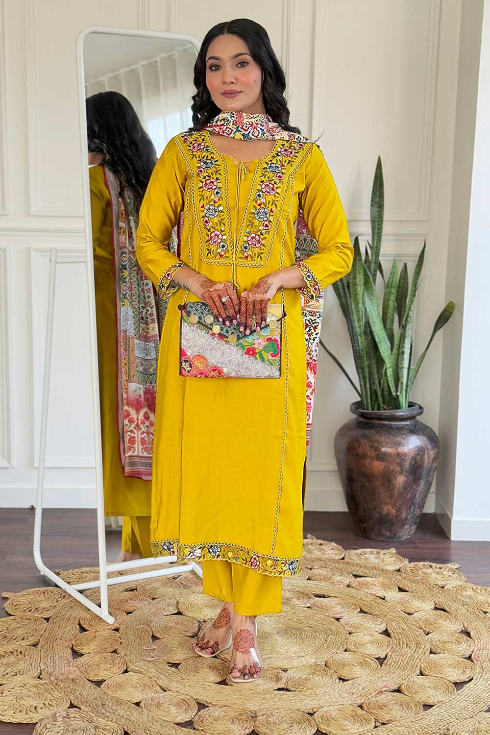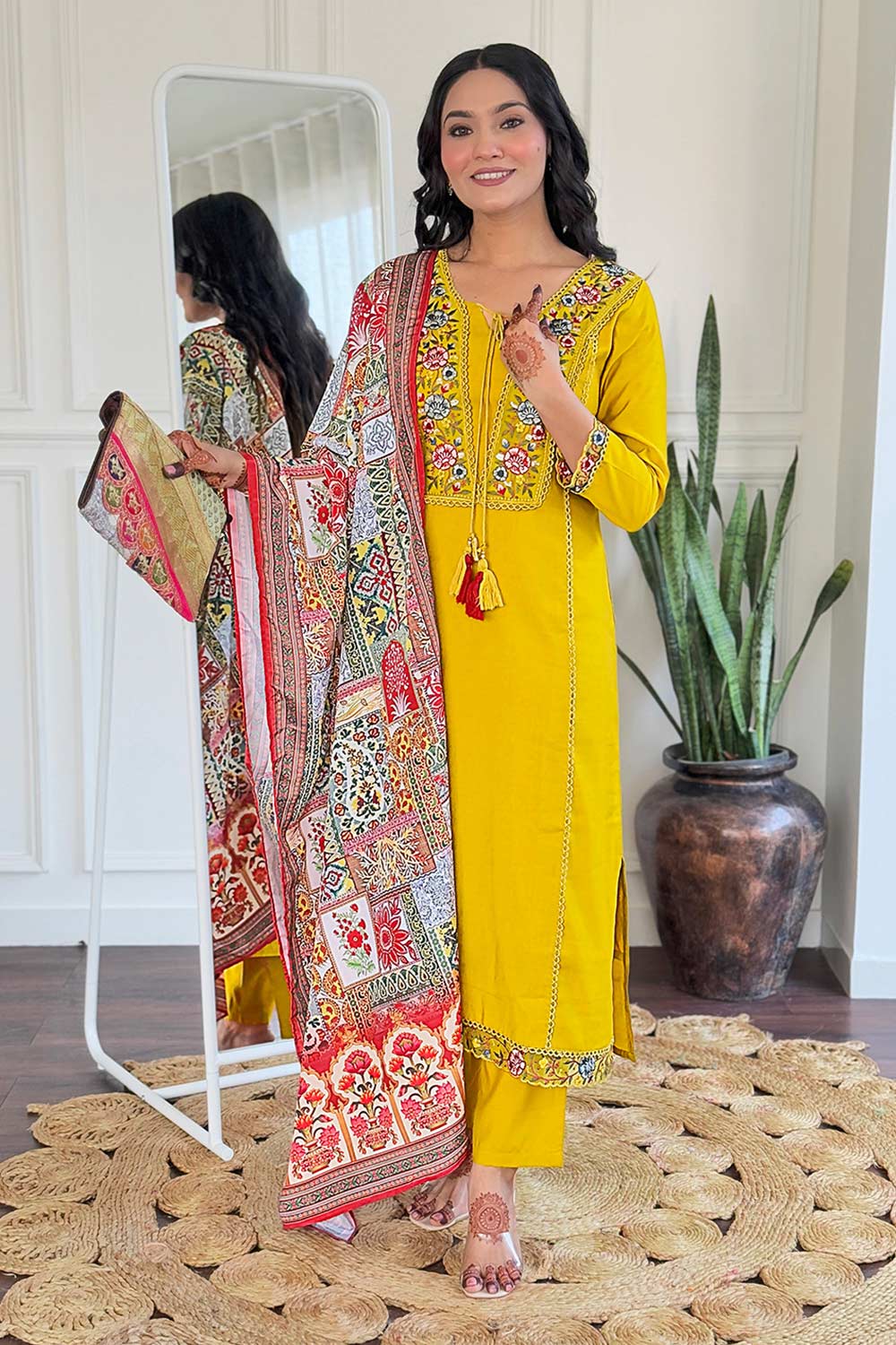 Stay stylish and comfortable with our Palazzo Suit Set designed for all-day elegance. Made with Viscose this set is perfect for easy movement and timeless appeal. The beautiful and intricate Embroidered elevate its design for Festivewear or daily wear, this kurti set is your go-to outfit. Pair it with elegant earrings and kolhapuri sandals or a heels for a traditional look or wedges for a modern edge