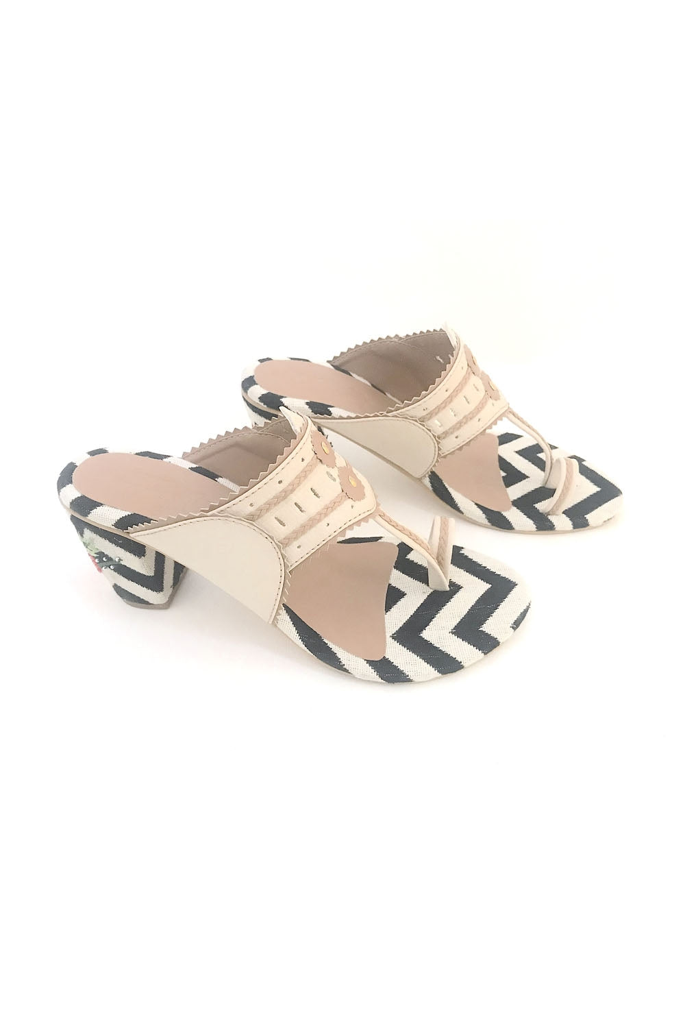 Patent Nude Kolapuri with Jacard Monochrome Fabric, Red Embroidered Roses with Kutdana, Two Tone Green leaves with White Pearls on 3 inch Block Heel .