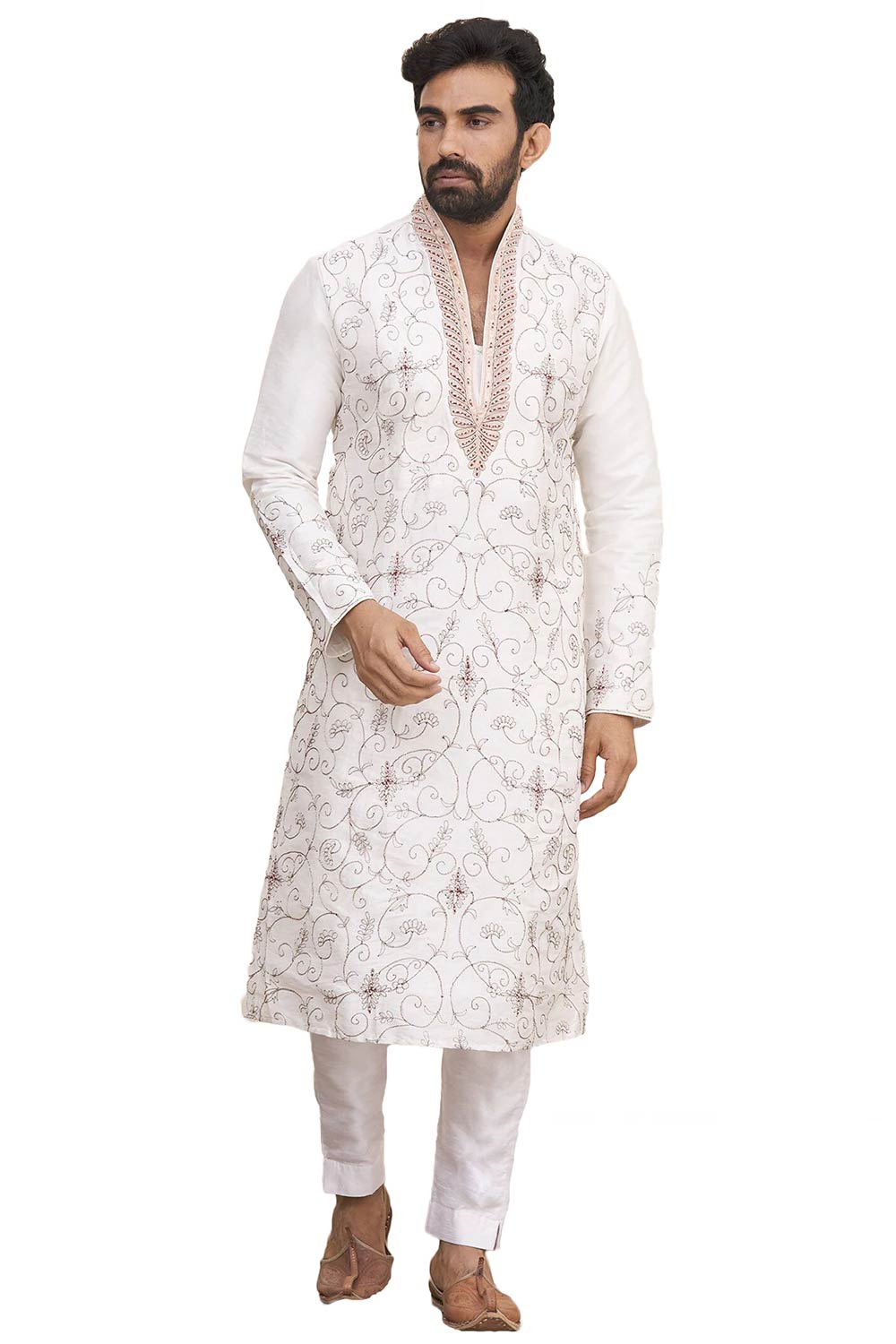 Men's Off White Silk Embroidered Full Sleeve Kurta Churidar - 40