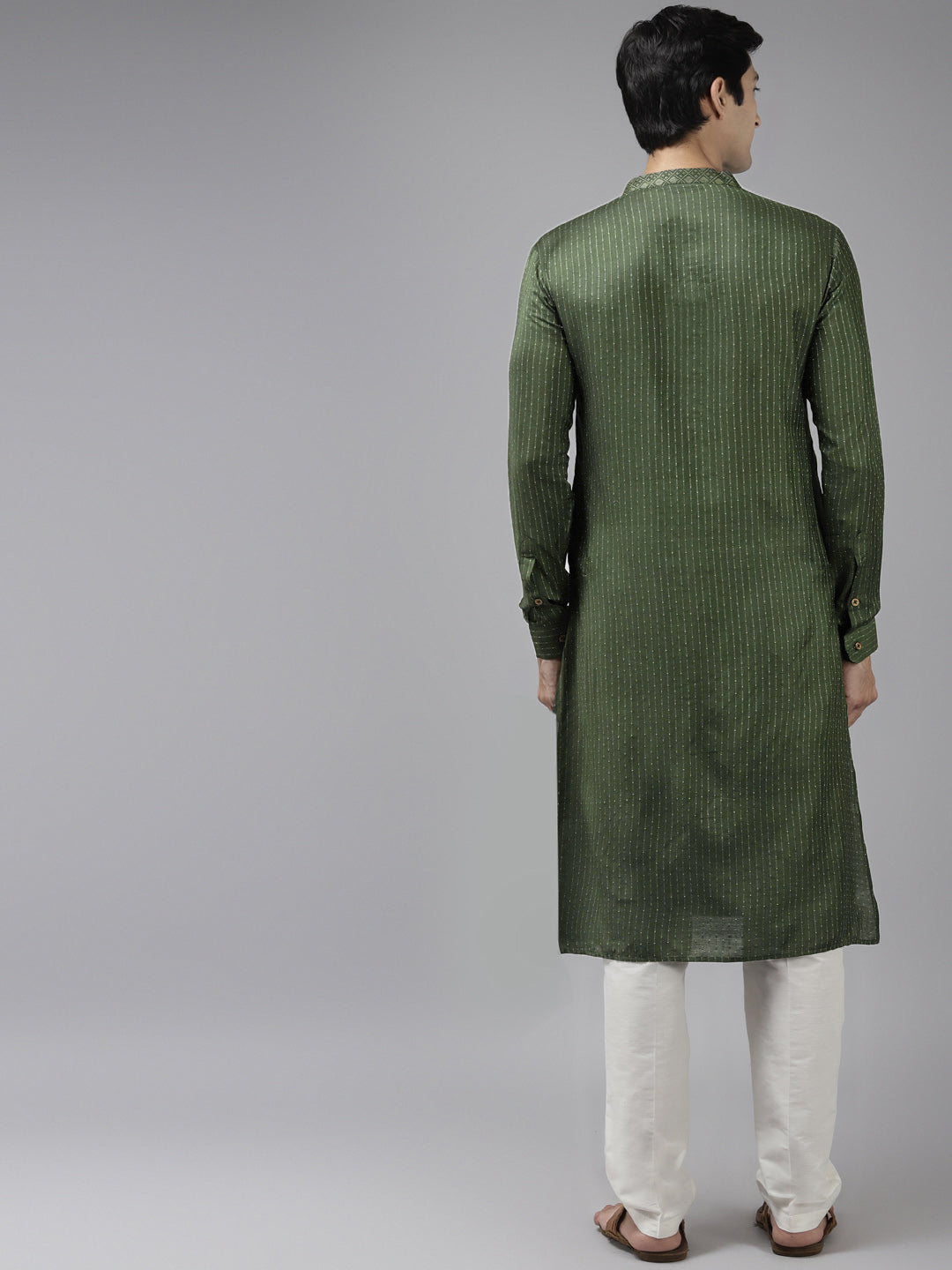 Men Green & Beige Woven Design Thread Work Kurta With Pyjama