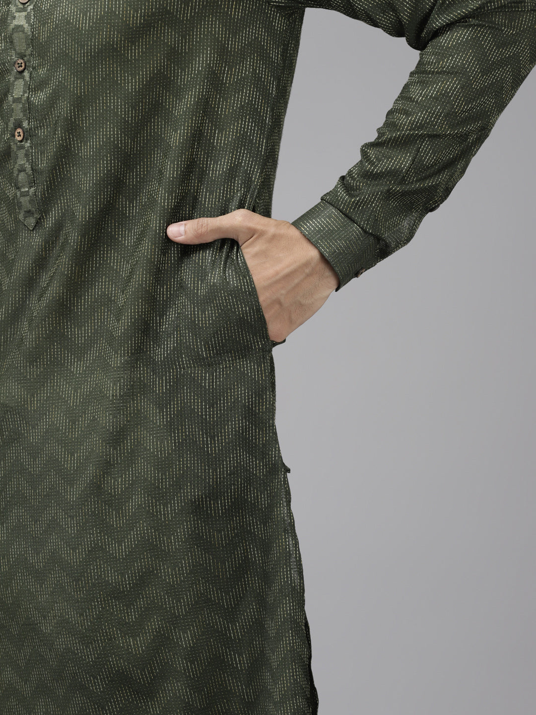 Men's Green Cotton Woven Thread Work Straight Kurta Top