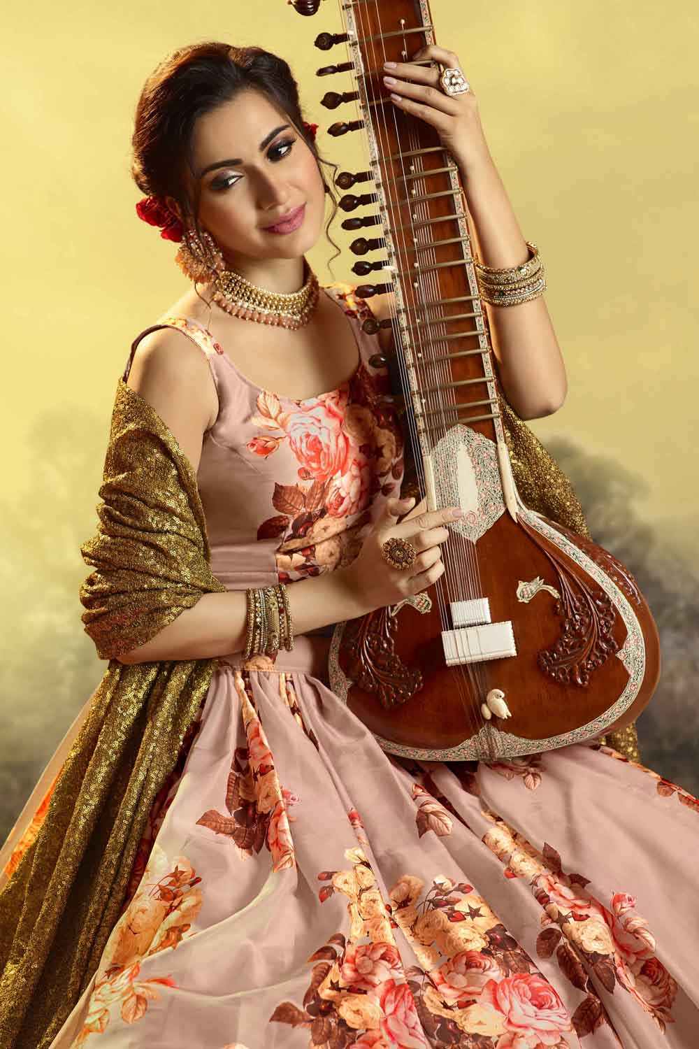 You will definitely earn lots of compliments wearing this designer printed lehenga choli in peach color paired with golden colored dupatta. This lehenga choli is organza based paired with georgette fabricated Sequins embroidered dupatta.