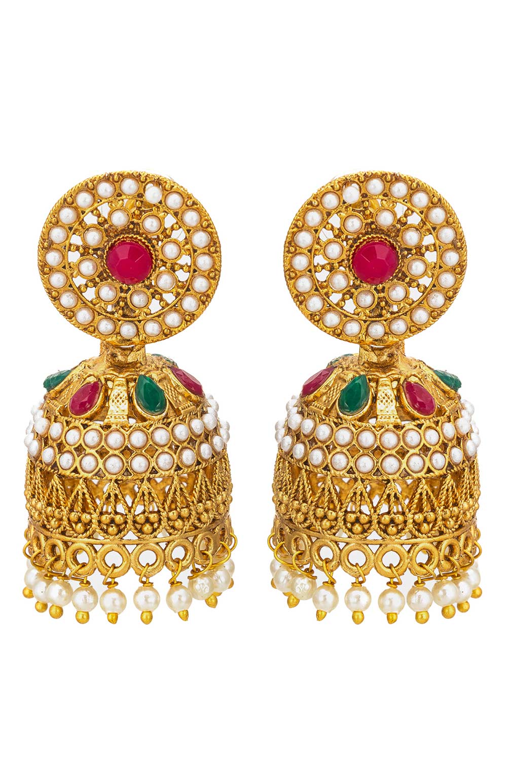 Elevate your look with these stunning Jumka earrings, crafted from brass and copper and adorned with vibrant artificial stones. Perfectly blending traditional charm with modern elegance, these earrings are ideal for weddings, festivals, and special occasions, adding a touch of grace to any ensemble.
