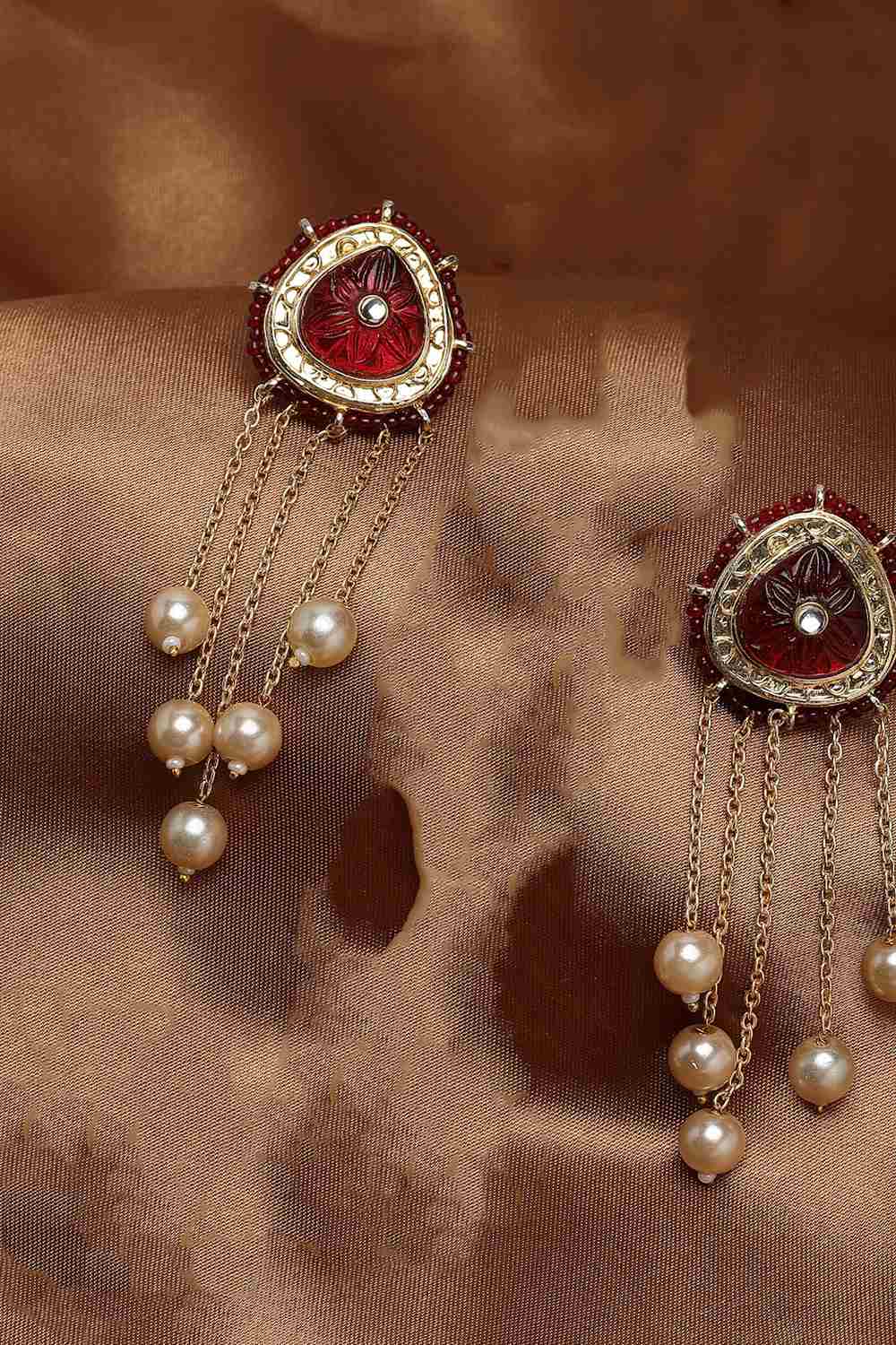 Upgrade your outfit with our Earring a dazzling pair of earrings designed to make a statement. Crafted from Alloy and adorned with Kundan, Pearls, Natural Stones, Faux Ruby these earrings are perfect for Partywear. Lightweight and versatile, they complement both traditional and modern outfits. Pair them with a matching necklace or wear them solo for effortless glamour