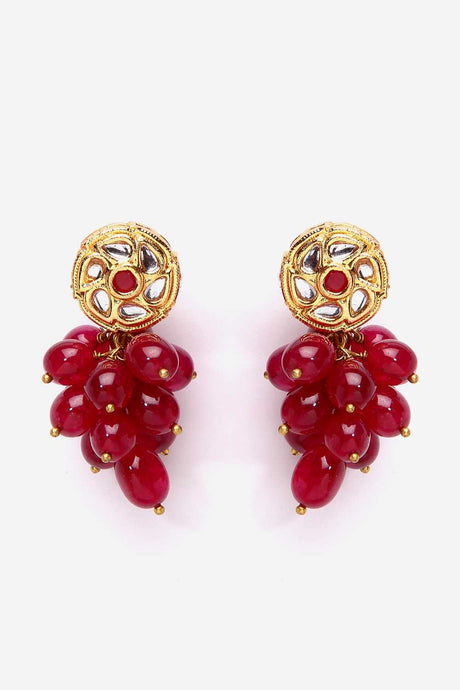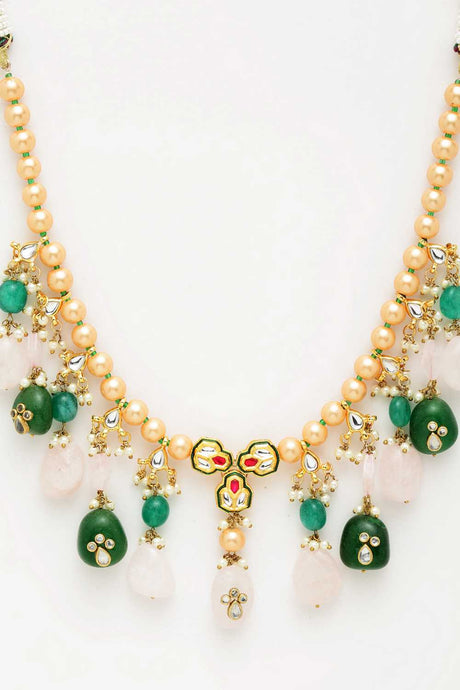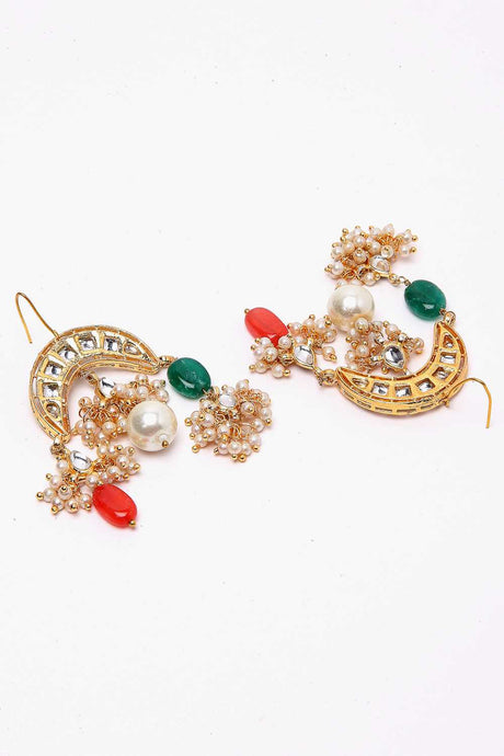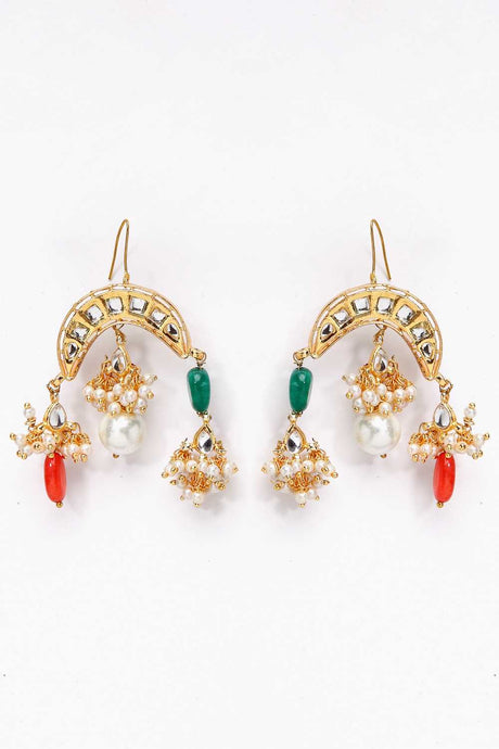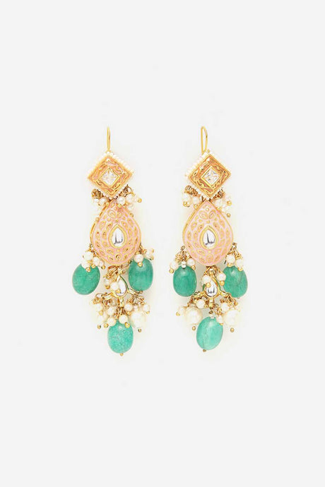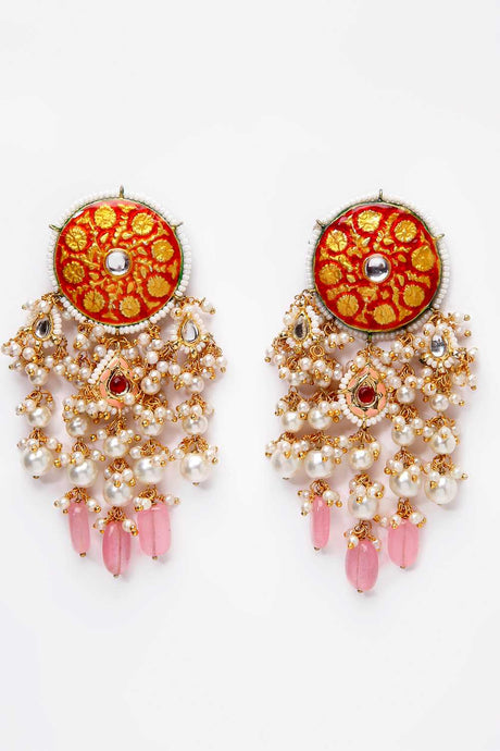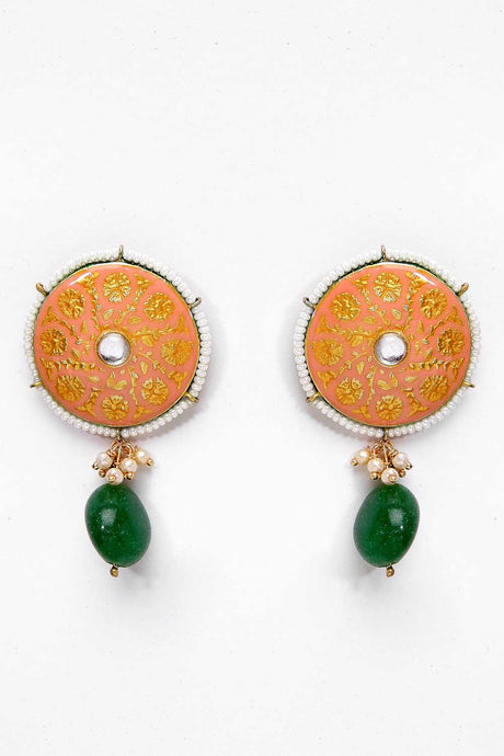Peach And Yellow Drop Earring With Kundan And Pearls