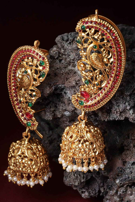 Red And Gold Jhumkas Earring With Pearls And Natural Stones