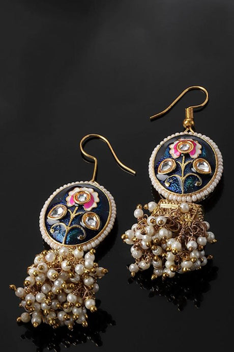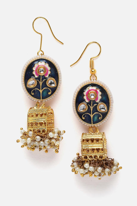Blue And Gold Jhumkas Earring With Kundan And Pearls