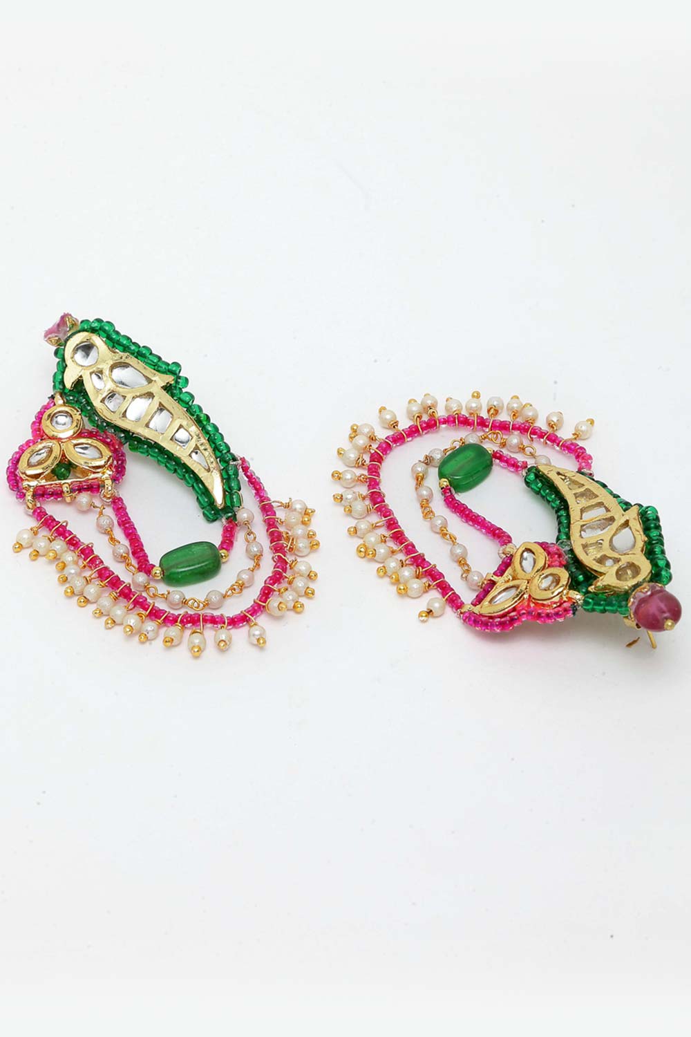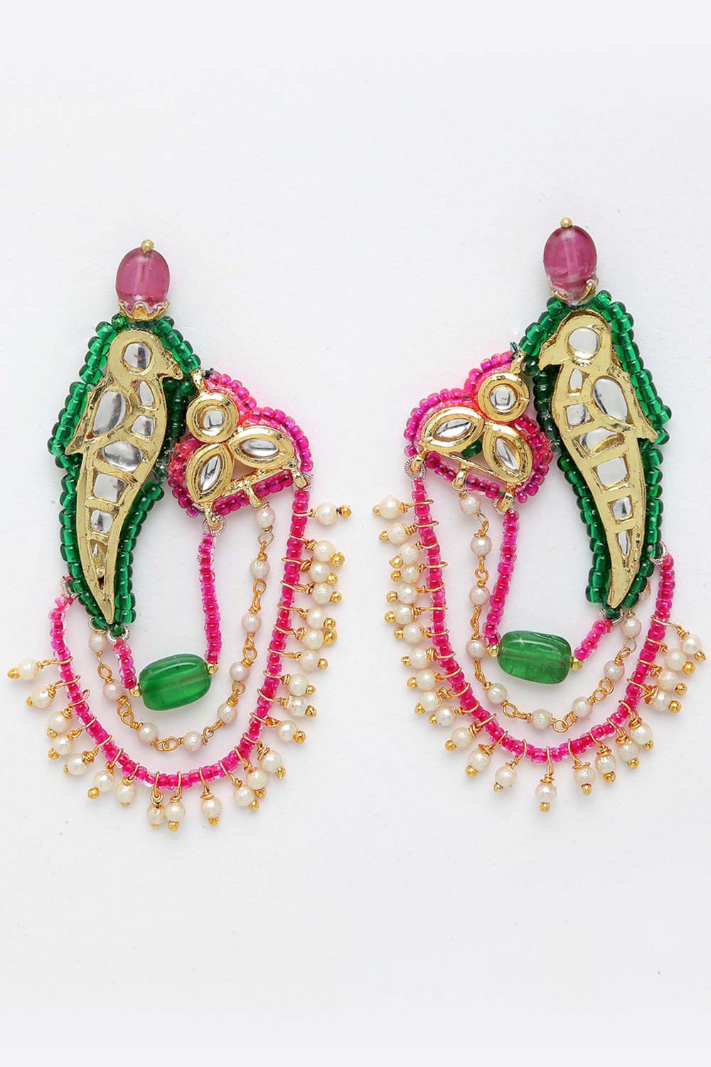 Pink And Green Gold-Plated Kundan And Pearls Dangler Earring