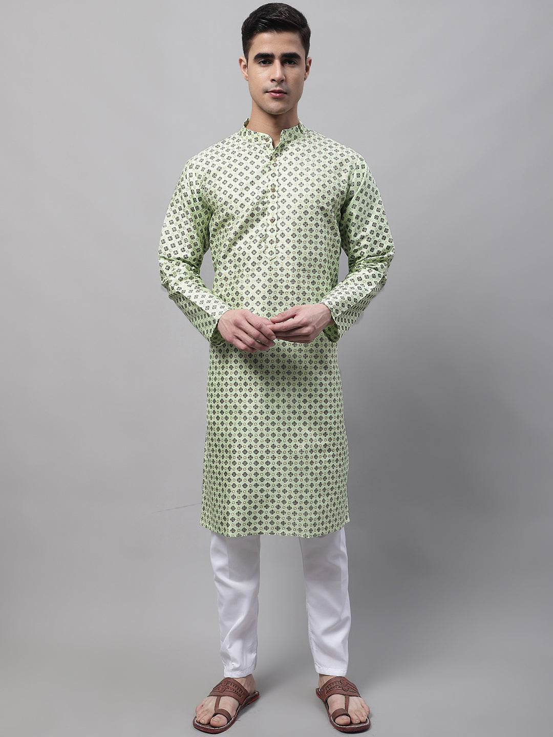 Men's Pista Green Printed Silk Blend Kurta Pajama
