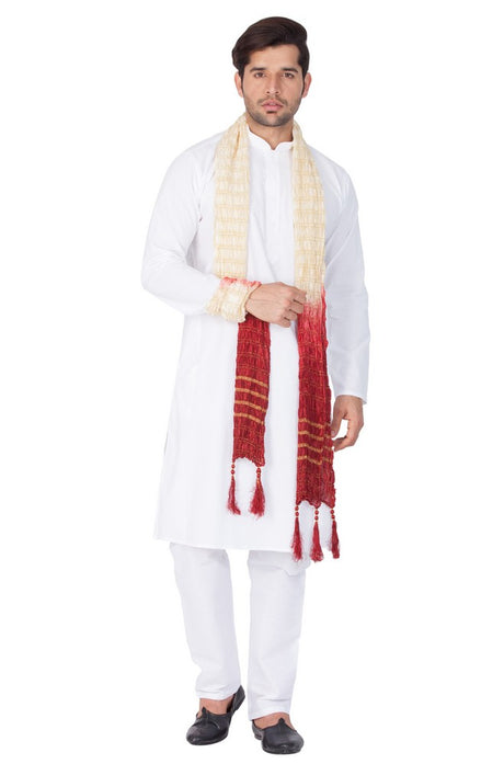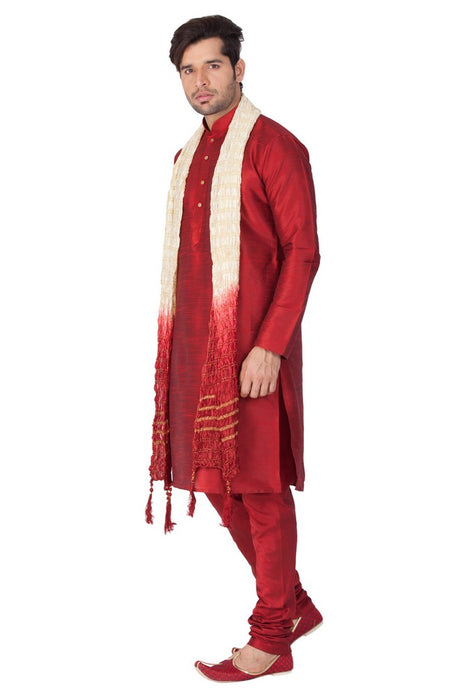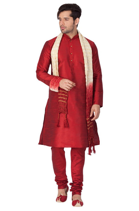 Men's Cotton Art Silk Solid Kurta Pajama And Dupatta Set In Maroon