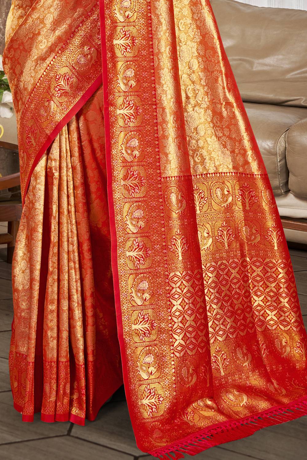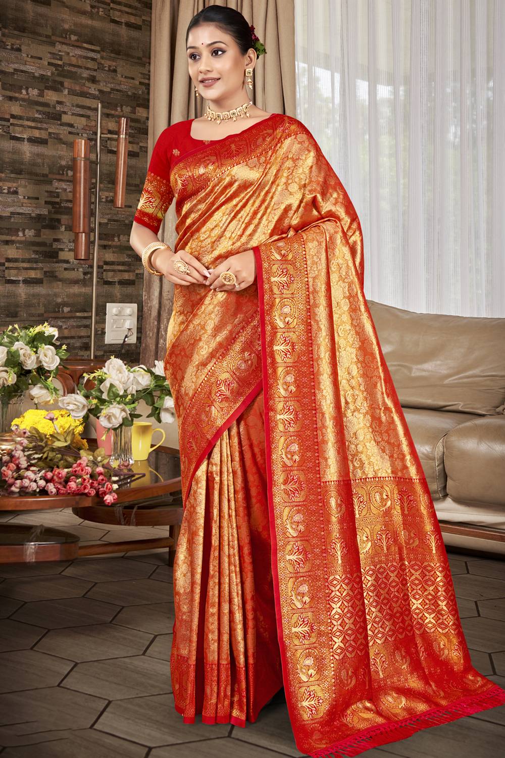 Elevate your wardrobe with our exquisite Saree a masterpiece crafted to add timeless elegance to your style. Made from Kanjivaram Silk this saree offers a perfect mix of comfort and sophistication. Adorned with Woven it showcases intricate craftsmanship that speaks volumes of tradition and artistry. Perfect for Sangeet, Festive this saree is a versatile addition to your collection, ensuring you stand out effortlessly. Pair it with elegant Jewelry, for a glamorous look. Add Clutches or Potli Bags and complete the ensemble with Wedges & Heels , making it a perfect choice for any event. Make a statement and embrace the elegance of Saree today