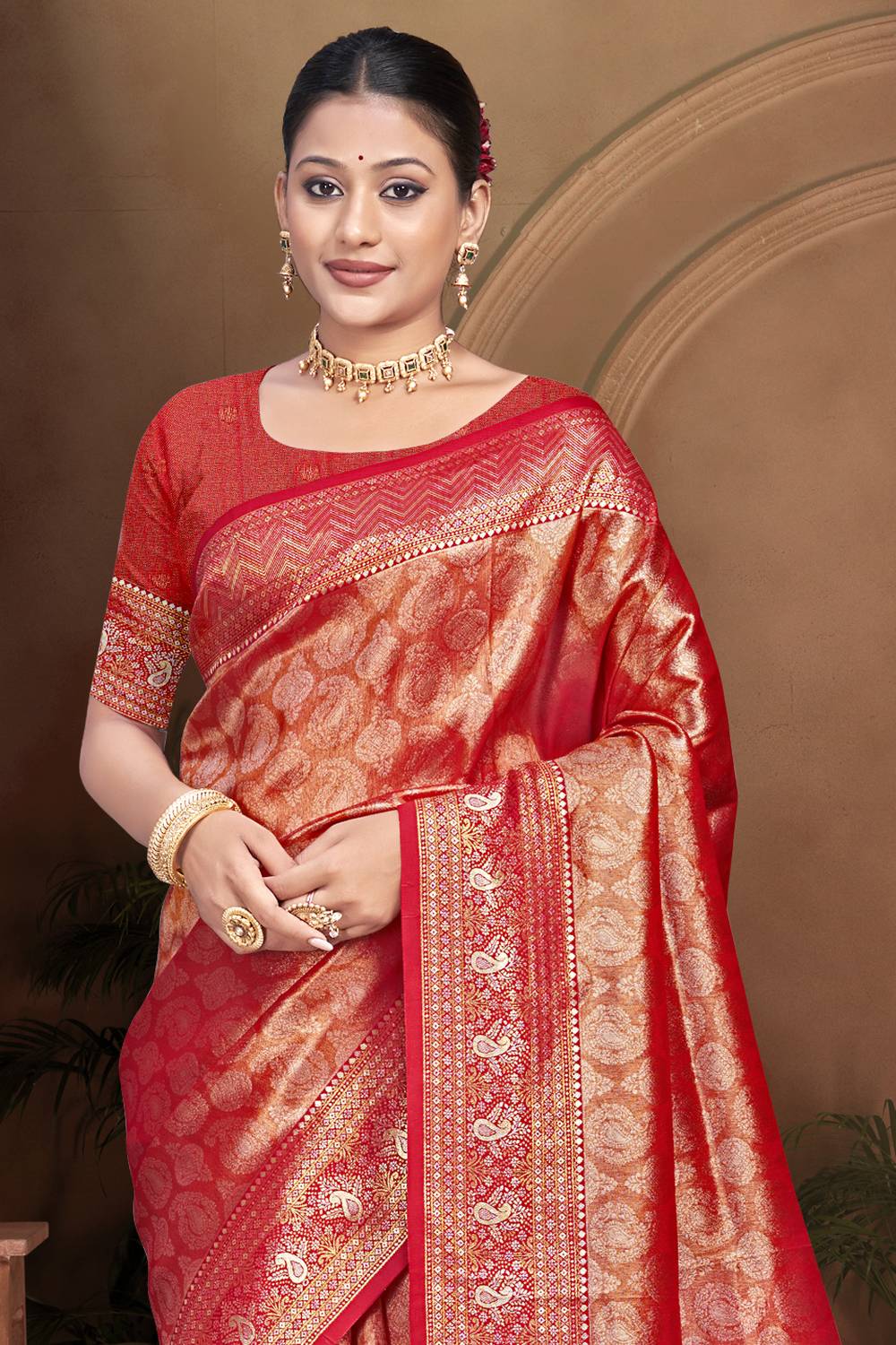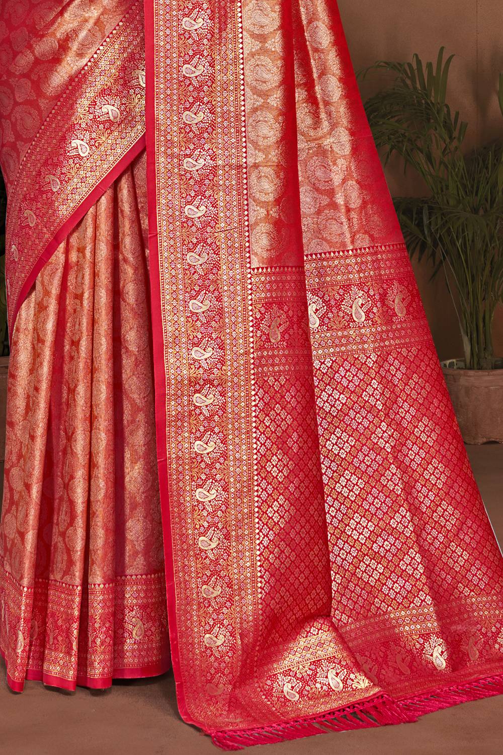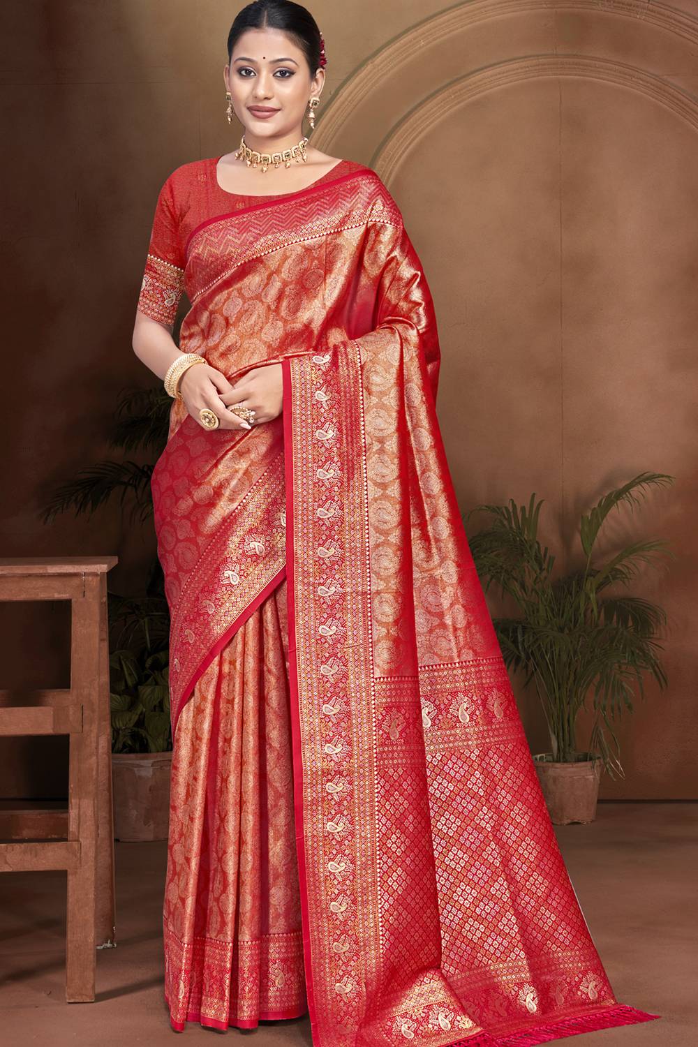 Elevate your wardrobe with our exquisite Saree a masterpiece crafted to add timeless elegance to your style. Made from Kanjivaram Silk this saree offers a perfect mix of comfort and sophistication. Adorned with Woven it showcases intricate craftsmanship that speaks volumes of tradition and artistry. Perfect for Sangeet, Festive this saree is a versatile addition to your collection, ensuring you stand out effortlessly. Pair it with elegant Jewelry, for a glamorous look. Add Clutches or Potli Bags and complete the ensemble with Wedges & Heels , making it a perfect choice for any event. Make a statement and embrace the elegance of Saree today