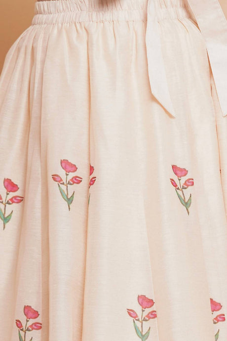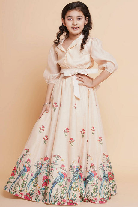 Boys Beige Poly Silk Gold Print Kids Kurta Churidar Set