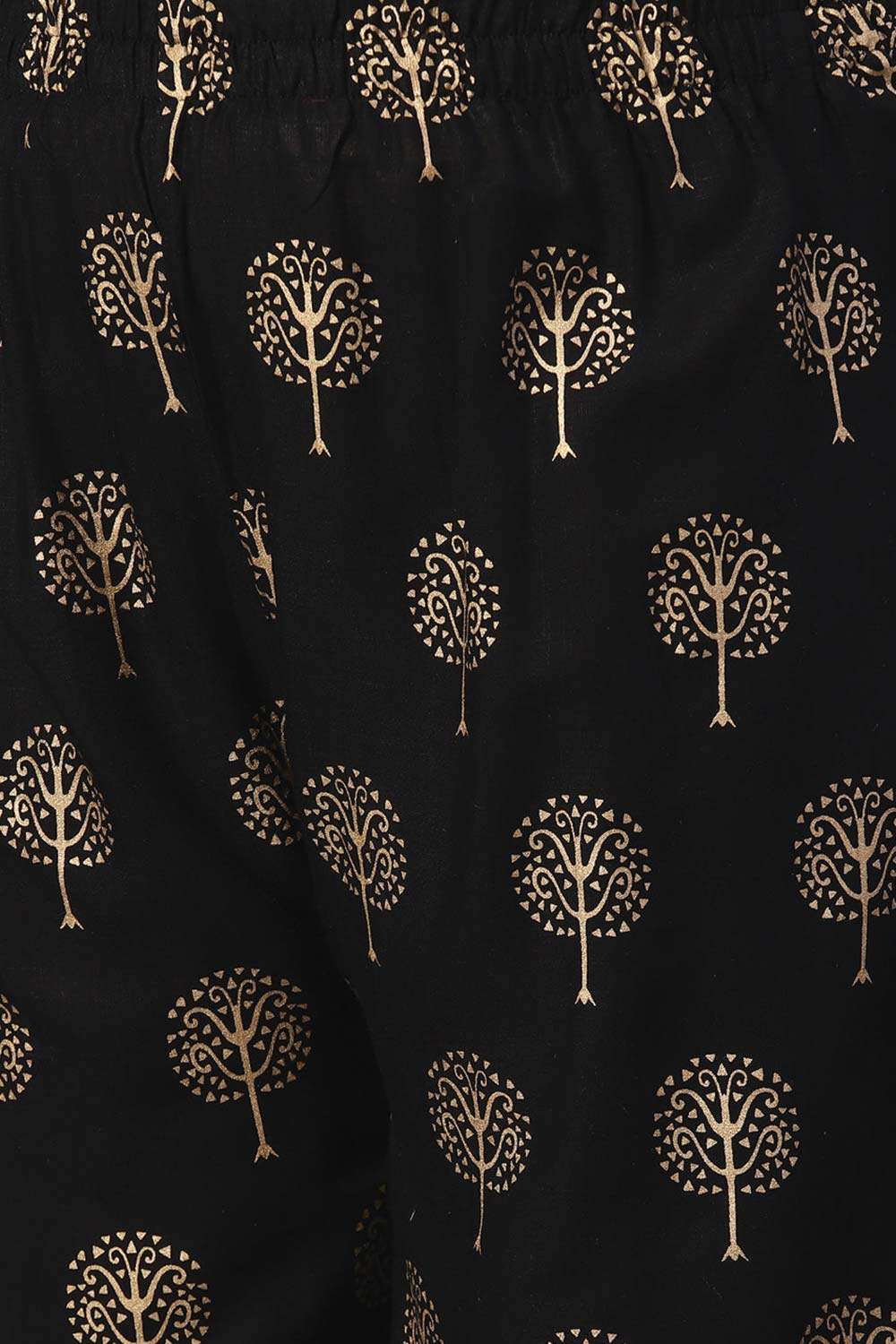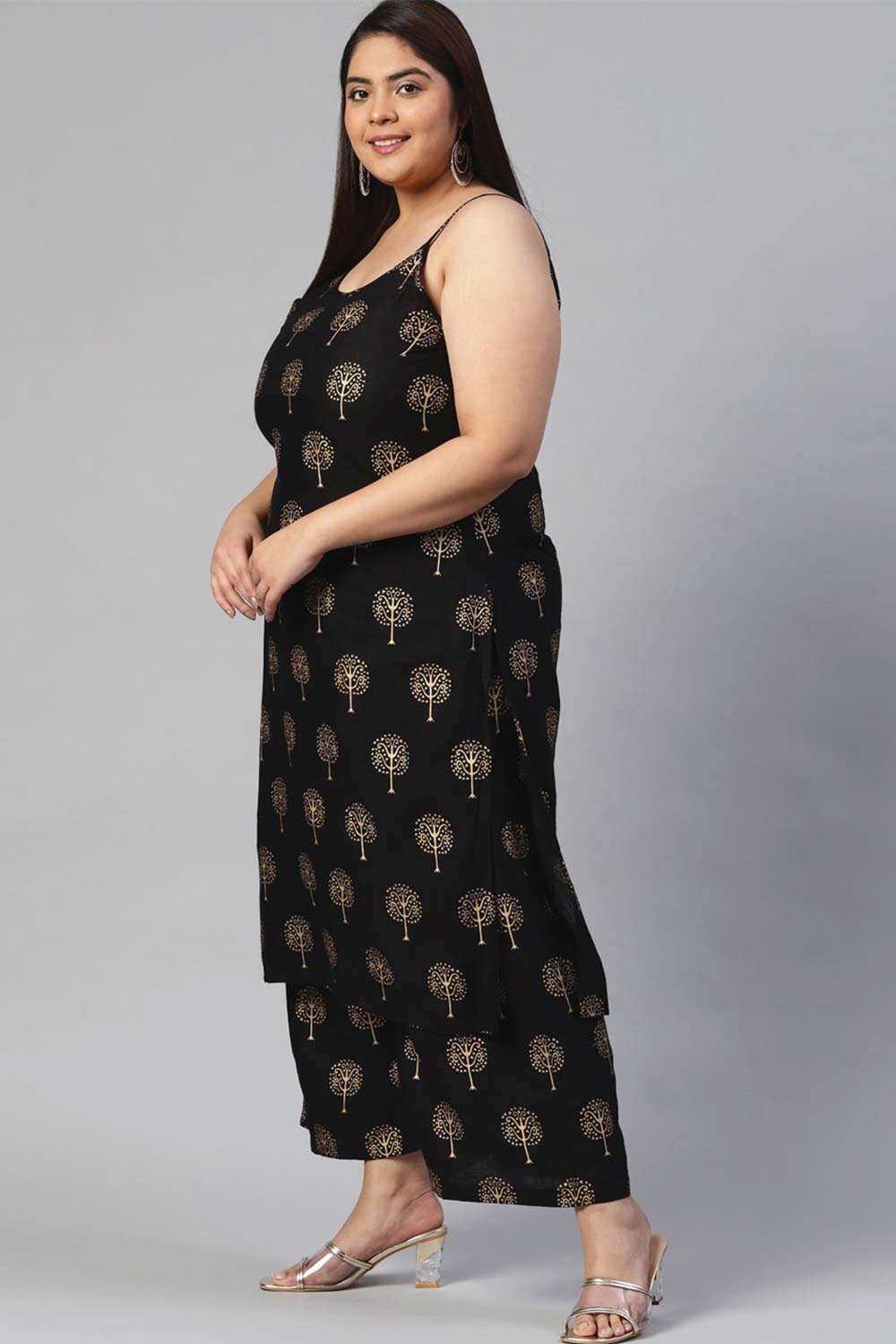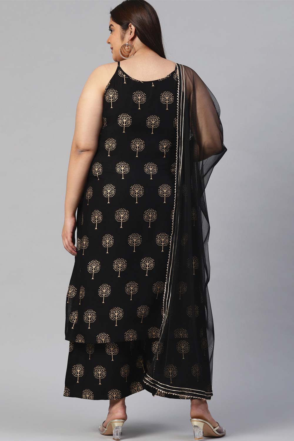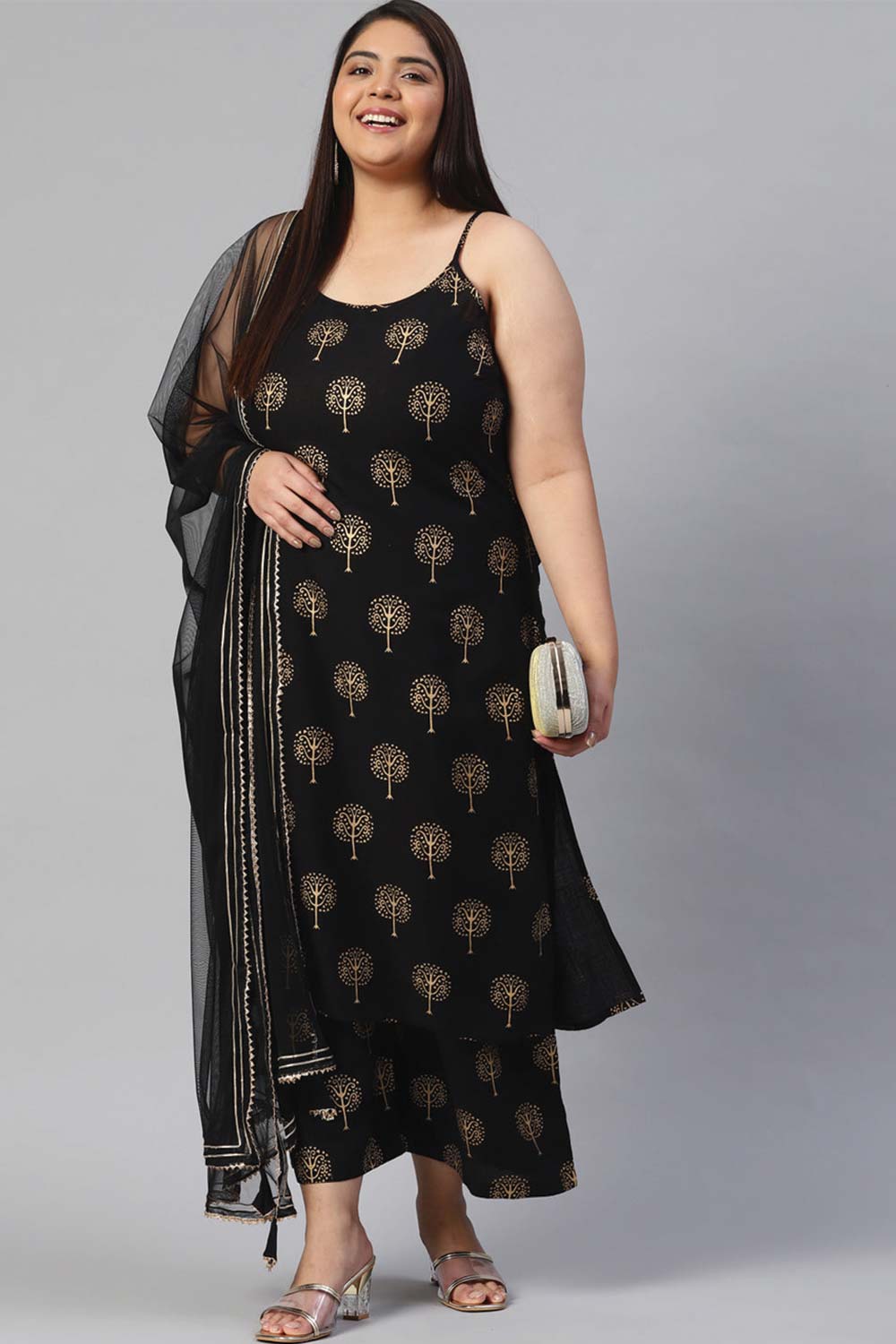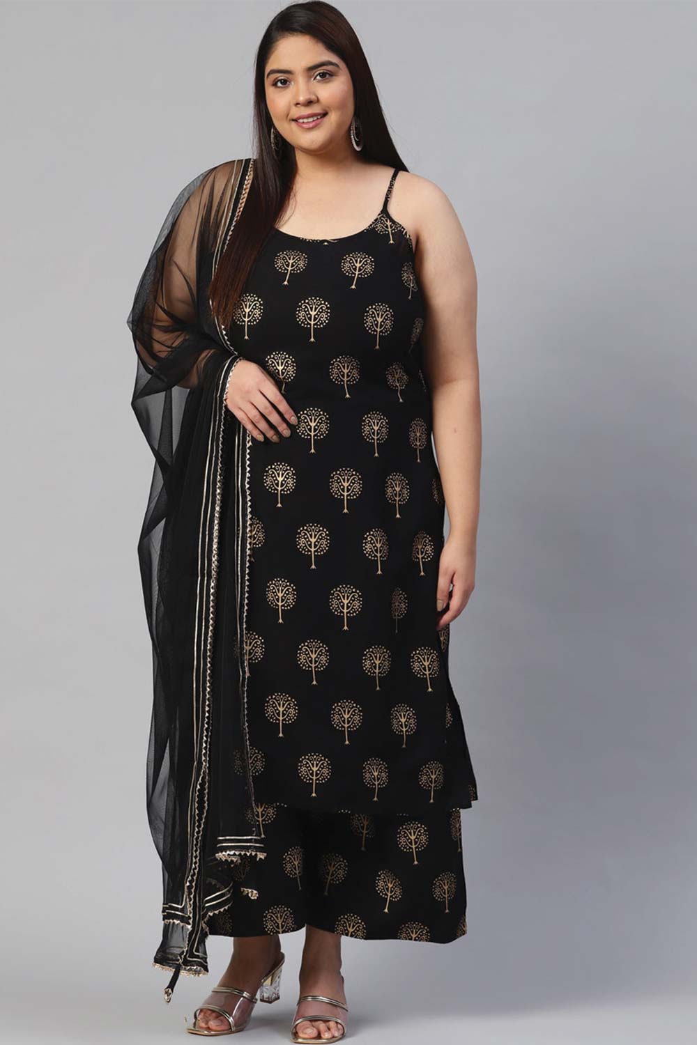 Every Time A Woman Can Define A New Fashion With Our Trendsetting Kurtis, Create Your Own Style Statement With The dressify Black golden Foil Printed shoulder strip Kurta Palazoo set with net Dupatta And Interesting Print On The Yok And All Over To Recreate That Extra Drama In Contemporary Clothing.