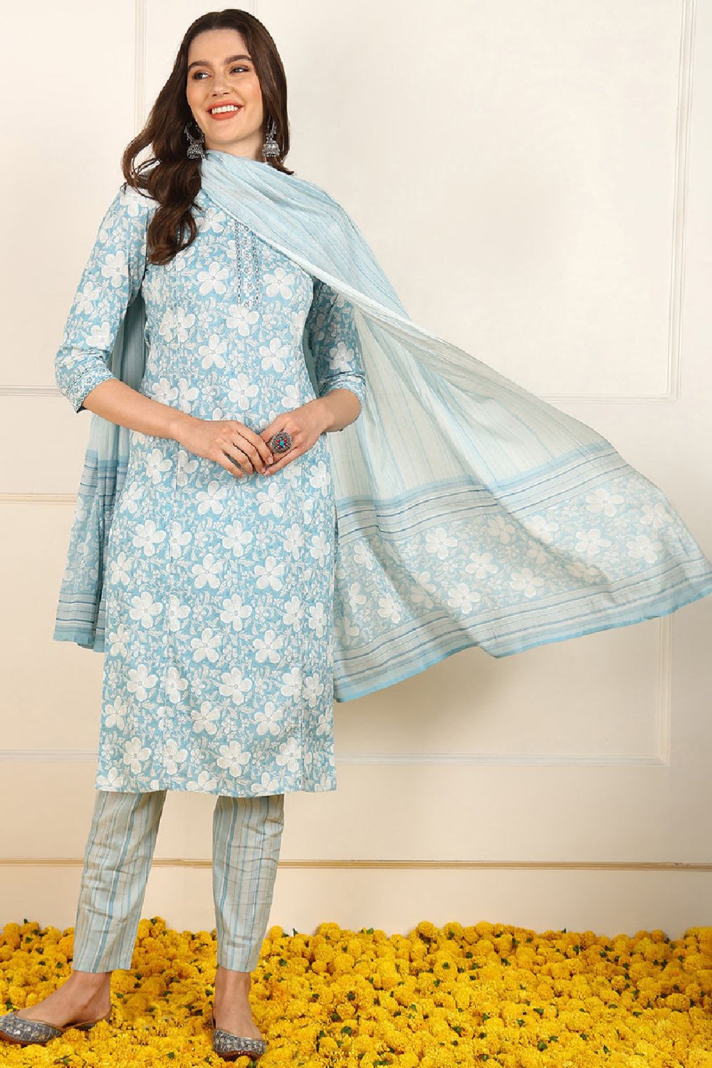 Blue Cotton Floral Printed Straight Cut Suit Set