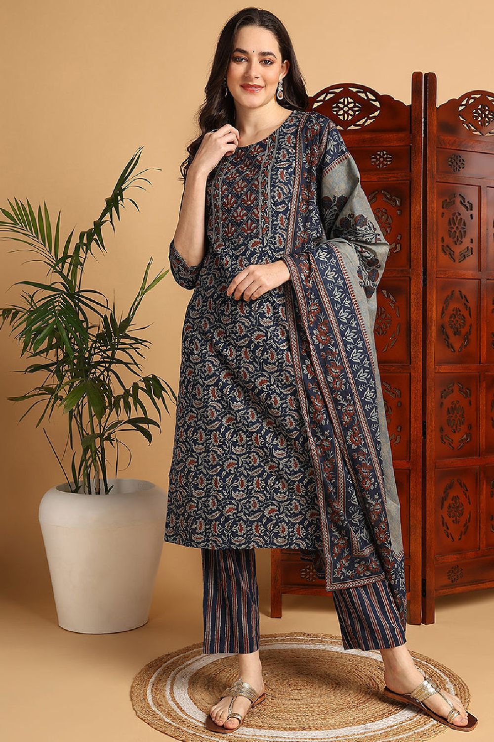 Blue Pure Cotton Floral Printed Kurti Pant Set