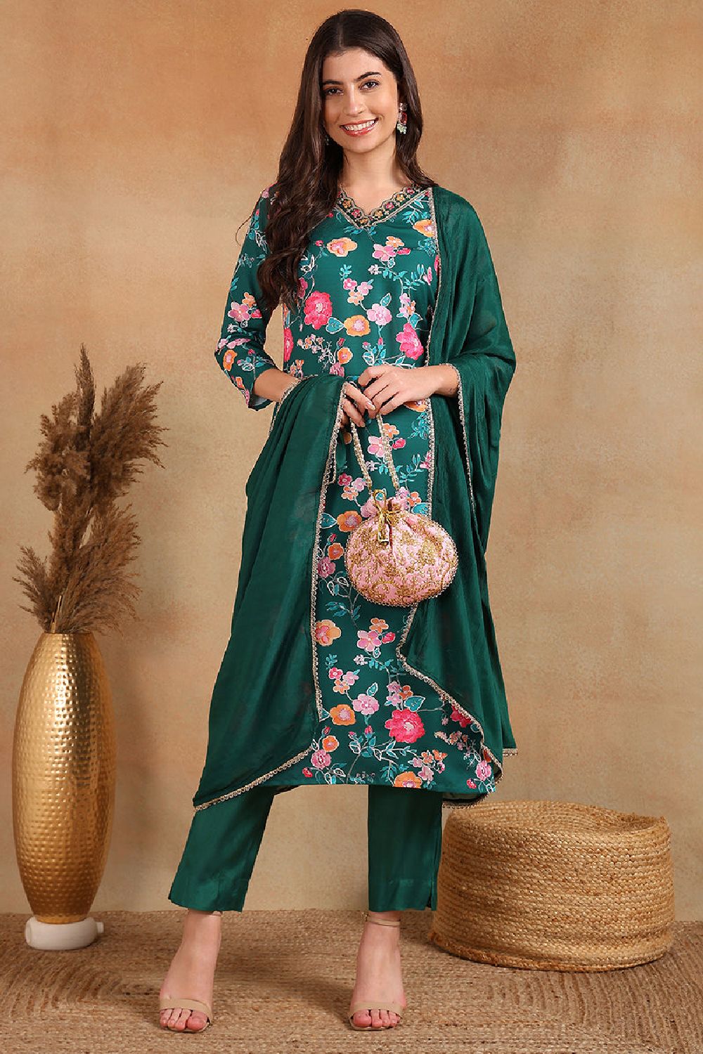 Green Polyester Floral Printed Straight Cut Pant Suit Set