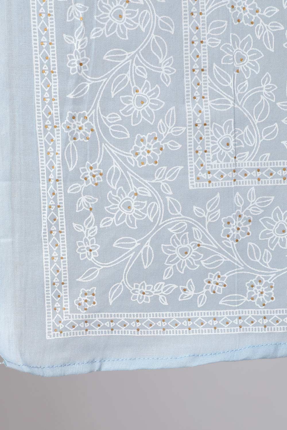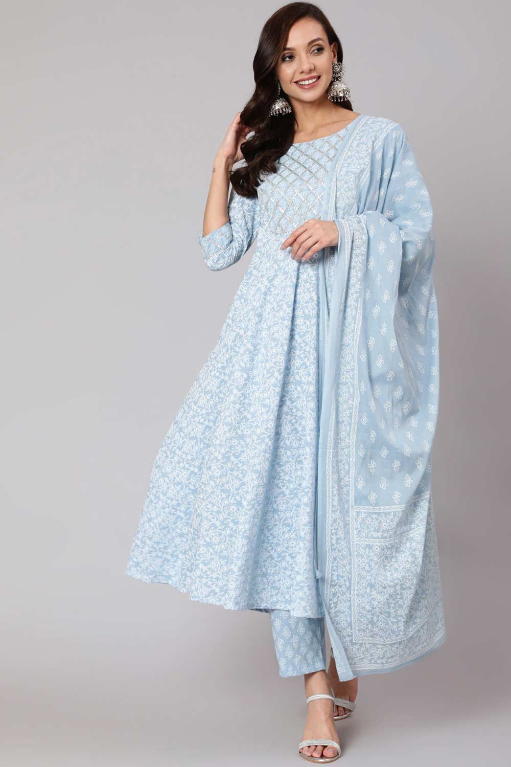 Light Blue Floral Printedt Flared Kurta With Trouser And Dupatta