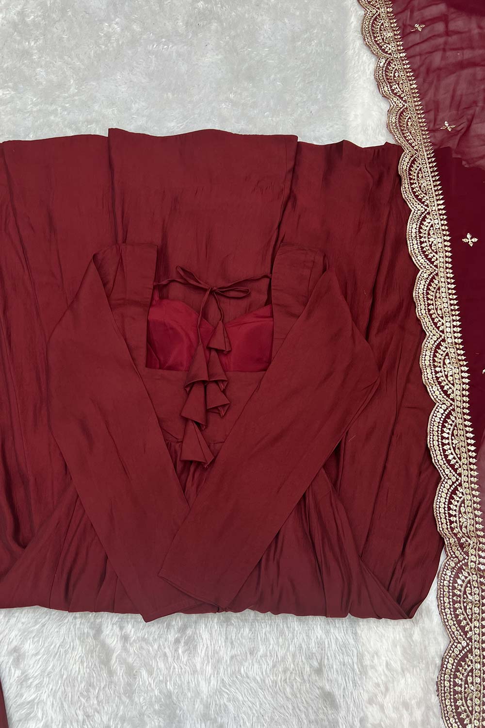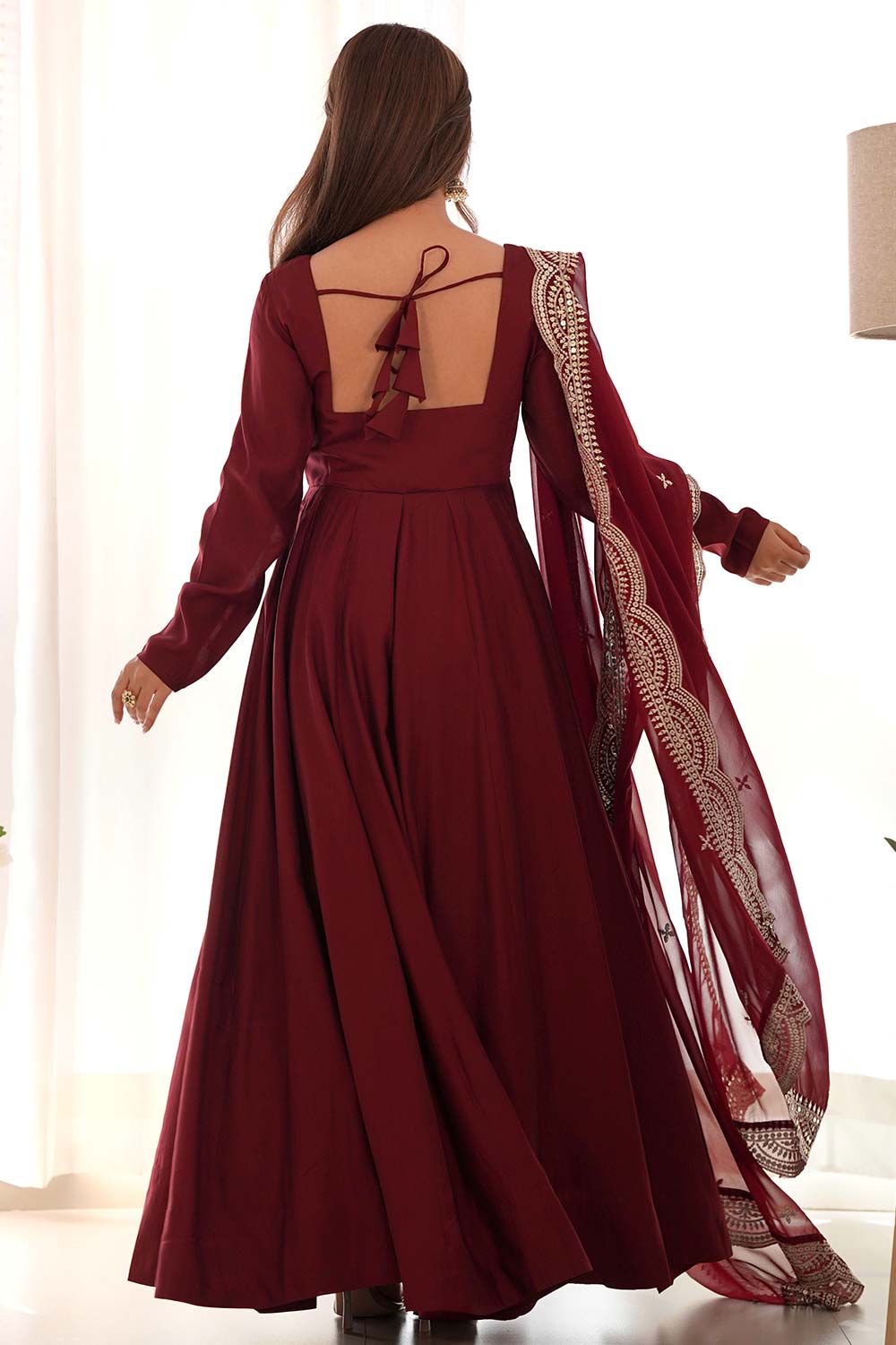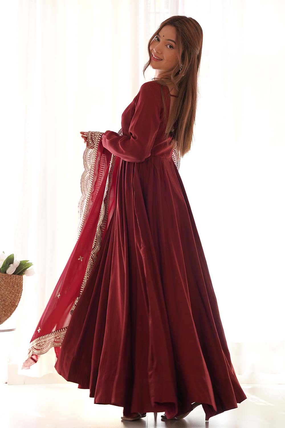 howcase timeless beauty in this Maroon Chanderi Solid Anarkali Suit Set. With intricate embroidery and full sleeves, it exudes elegance and charm, making it a perfect pick for any celebration.