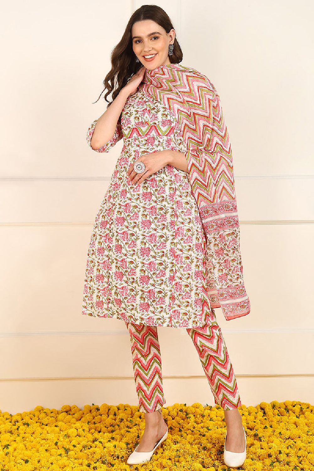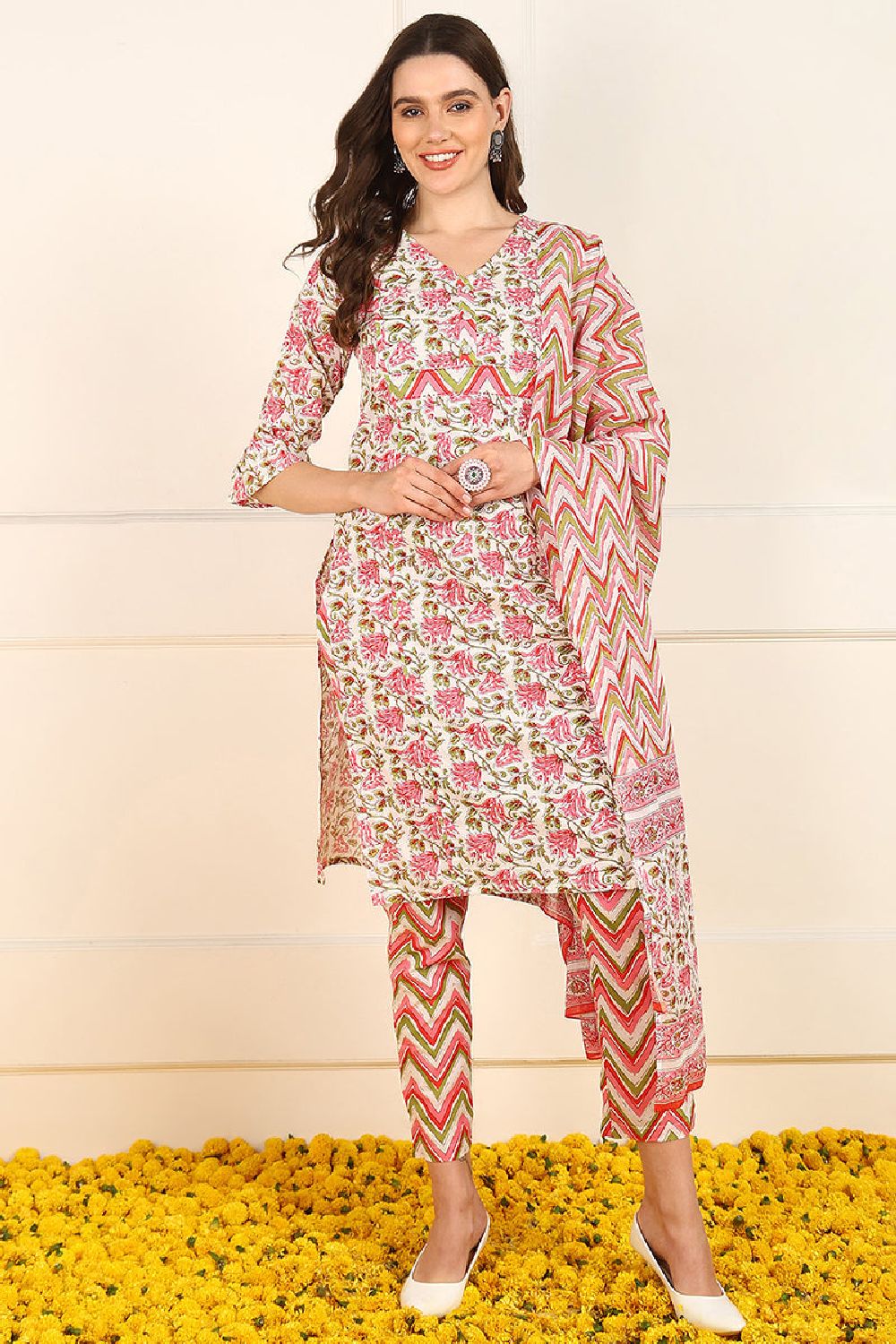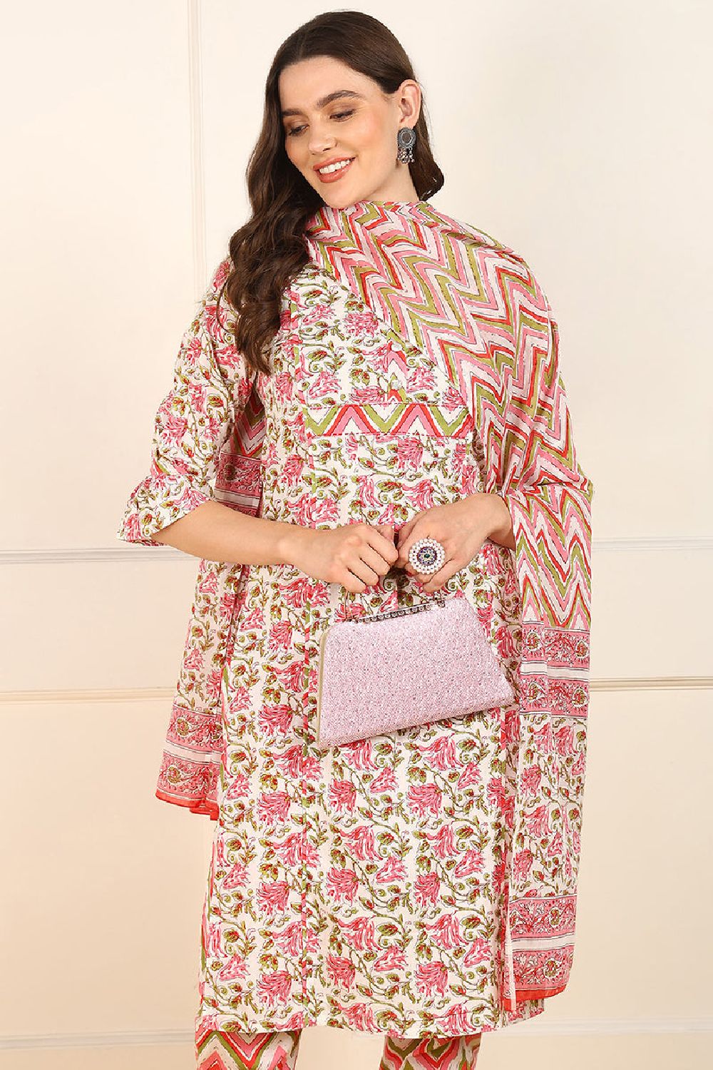 Pink Cotton Floral Printed Straight Cut Suit Set