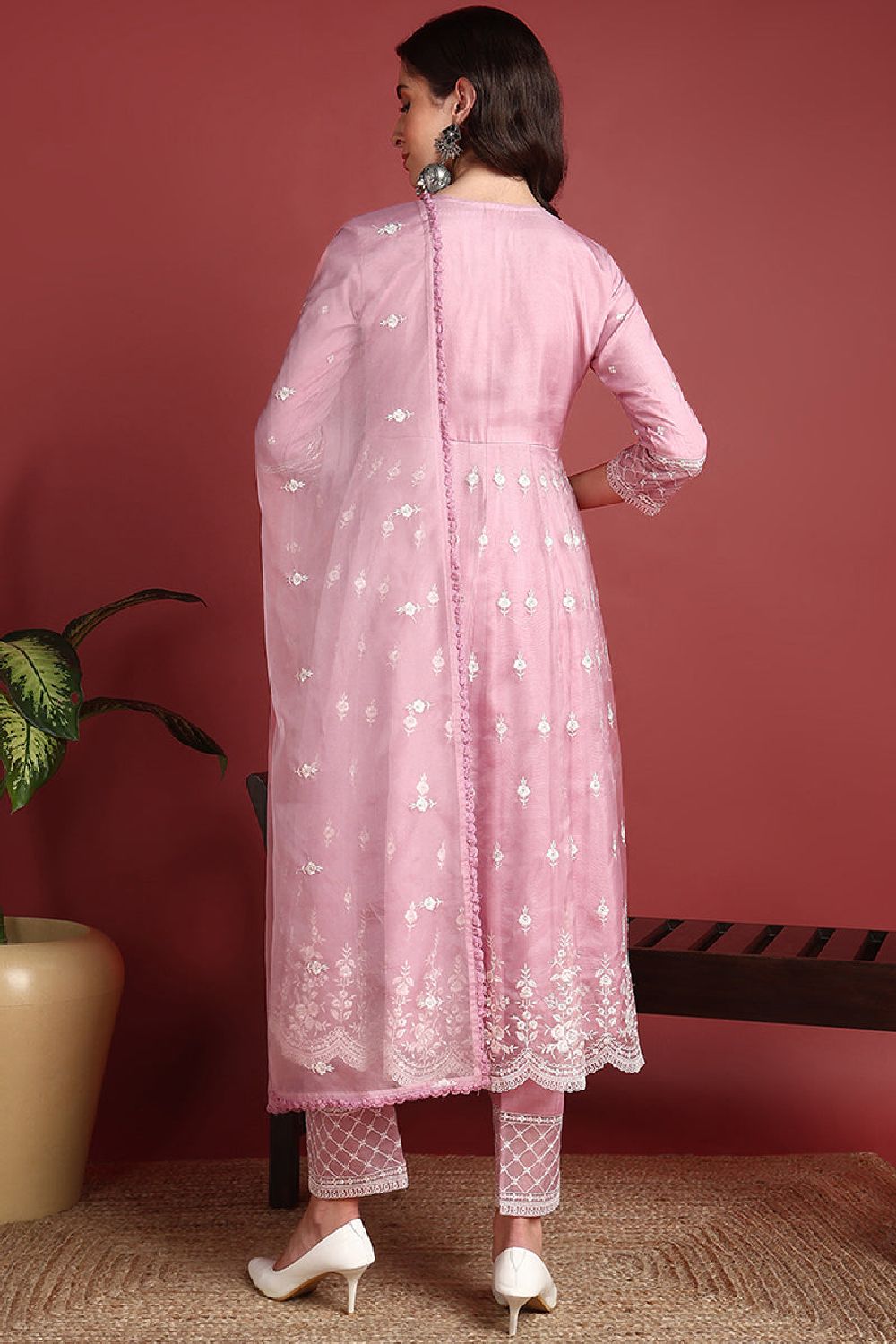 Pink Organza Solid Embroidered Anarkali Suit Set