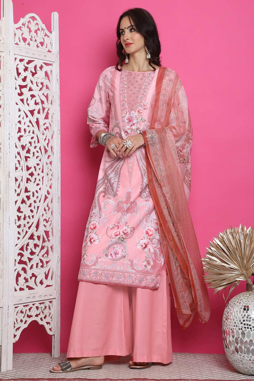 Achieve effortless style in the Pink Satin Digital Printed Kurta Suit Set , perfect for casual outings or festive gatherings.