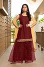 Elevate your ethnic wardrobe with this beautifully crafted cotton embroidered Sharara suit set. The delicate floral embroidery enhances its charm, while the flowy sharara pants provide an elegant and graceful silhouette.