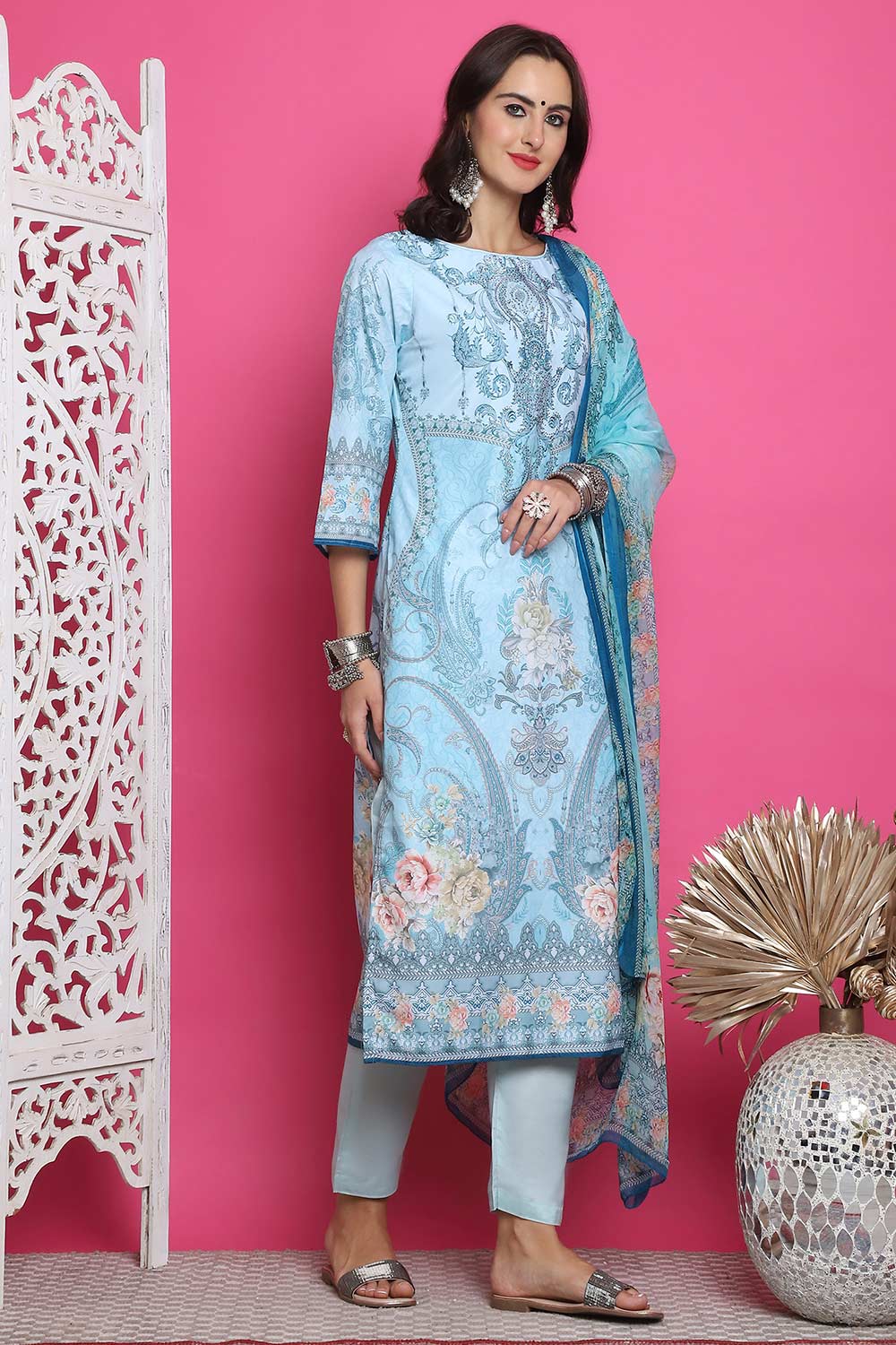 Radiate charm in the Turquoise Satin Digital Printed Kurta Suit Set , adorned with delicate digital prints on soft muslin fabric.