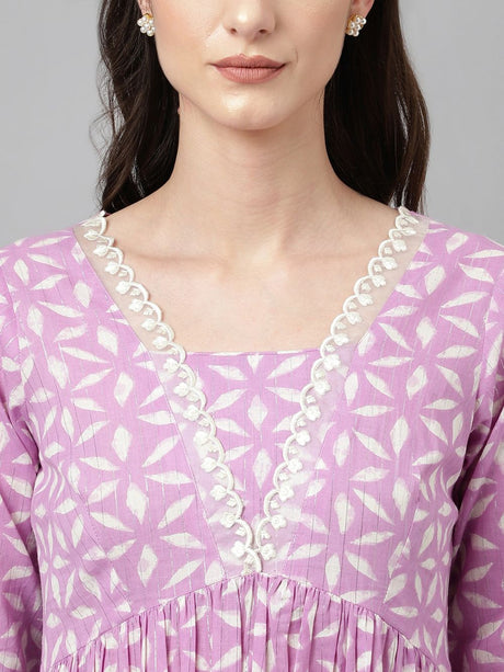 Purple Cotton Printed Anarkali Suit Set
