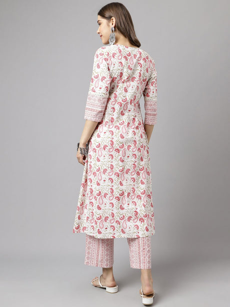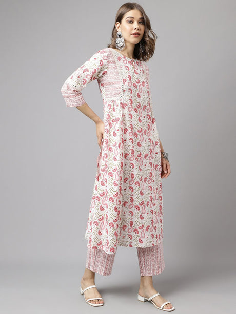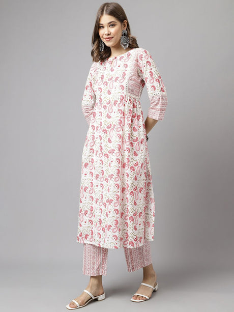 White Cotton Printed Kurti Pant Set