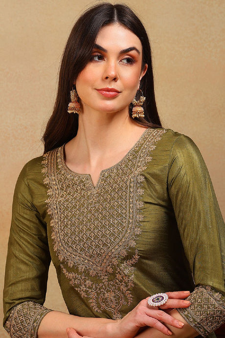 Olive Silk Blend Solid Embroidered Straight Cut Suit Set