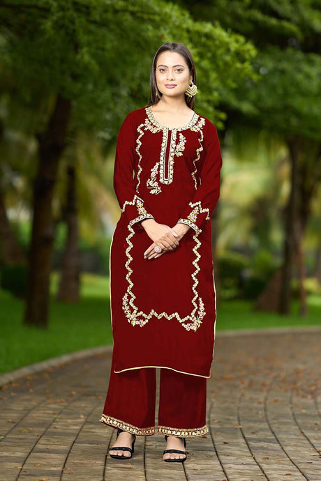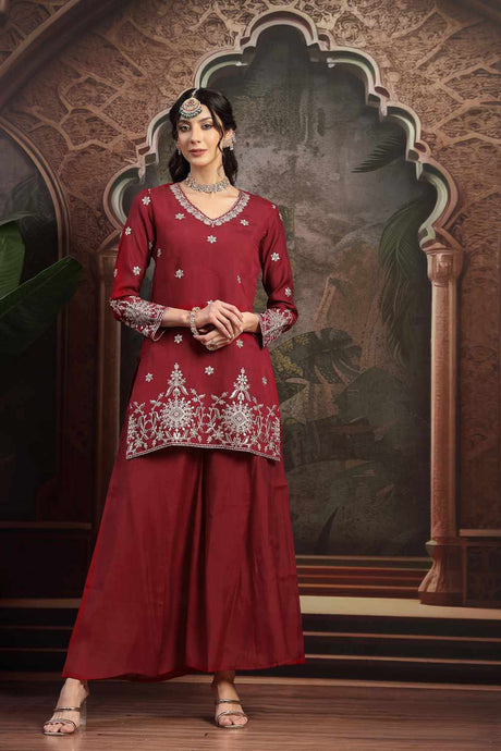Maroon Embroidery Chanderi Silk Kurti Palazzo Set