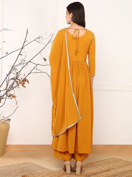 Mustard Georgette Solid Embroidered Straight Kurti Palazzo With Dupatta
