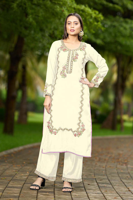 Cream Hand Embroidery Art Silk Straight Cut Kurti Palazzo Set