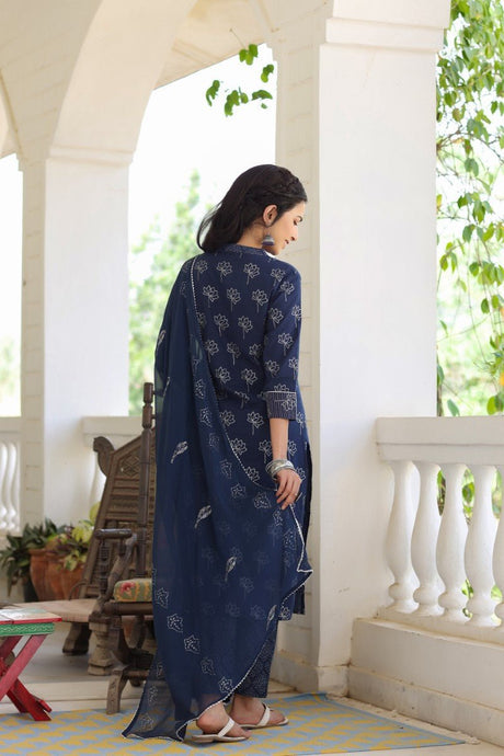 Navy Blue Floral Printed Kurti With Palazzos With Dupatta